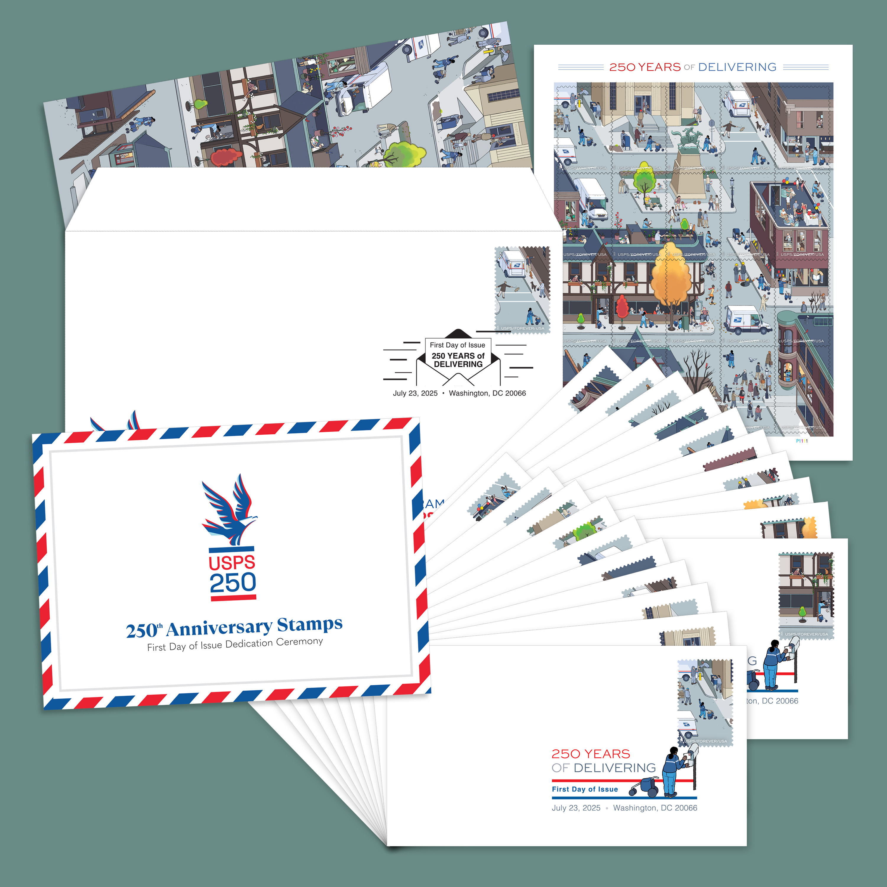 This collectible comes with everything you need to celebrate the 250 Years of Delivering issuance. It contains the First Day of Issue Ceremony Invitation, the First Day of Issue Ceremony Program, a set of 20 Digital Color Postmark First Day Covers, and a mint pane of 20 250 Years of Delivering Forever® stamps.
