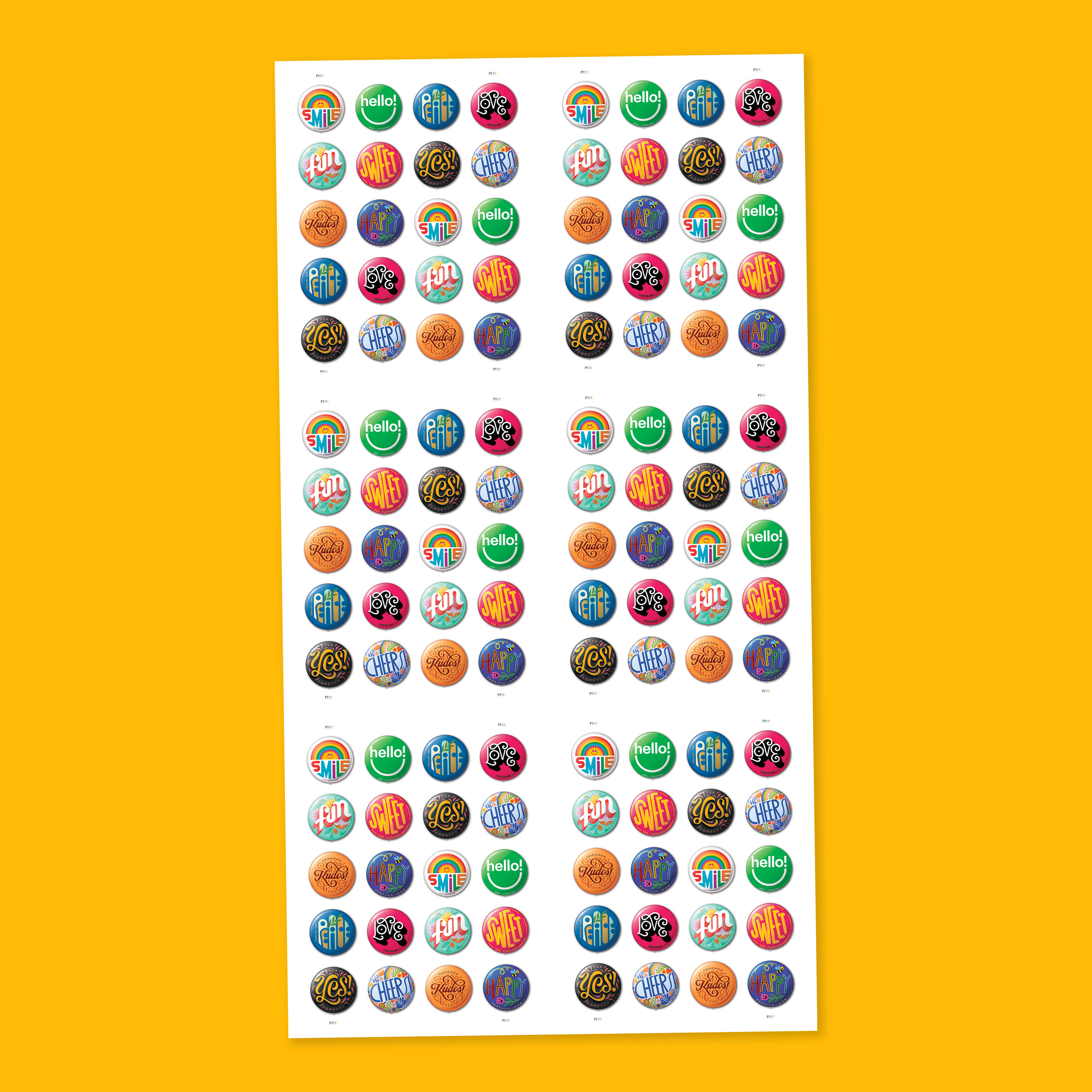 Appreciate 10 cheery, whimsical designs with this Pinback Buttons press sheet without die cuts.