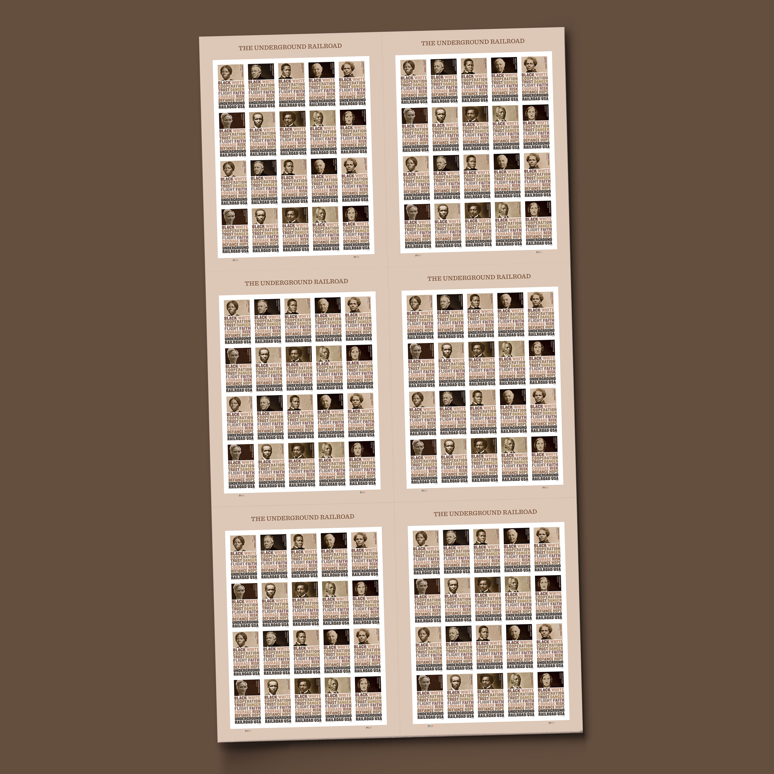 The press sheet contains 6 sheets of The Underground Railroad Forever® stamps positioned 2 across by 3 down.