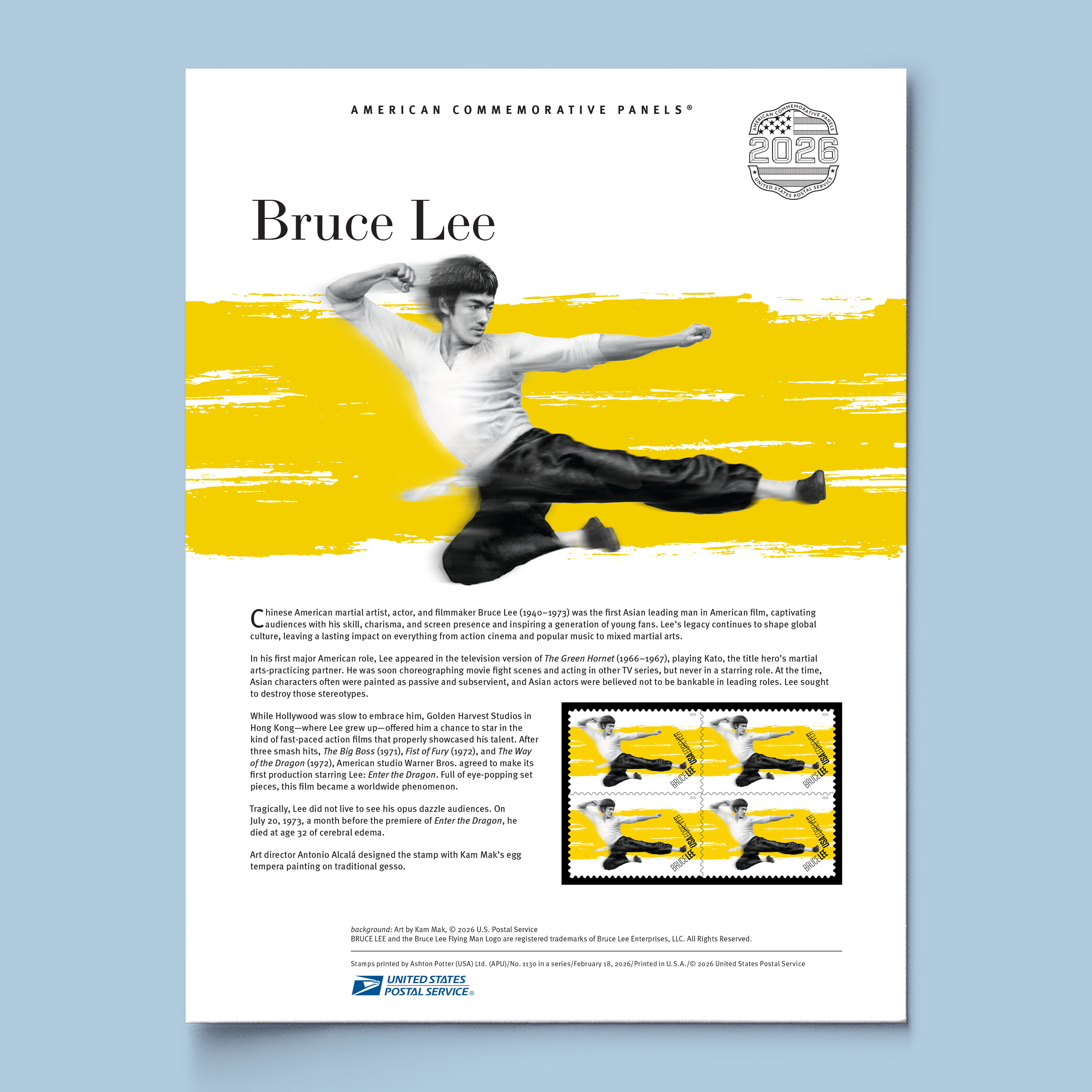 Honor a Chinese American martial artist, actor, and filmmaker and the release of these bold stamps with the Bruce Lee Commemorative Panel.