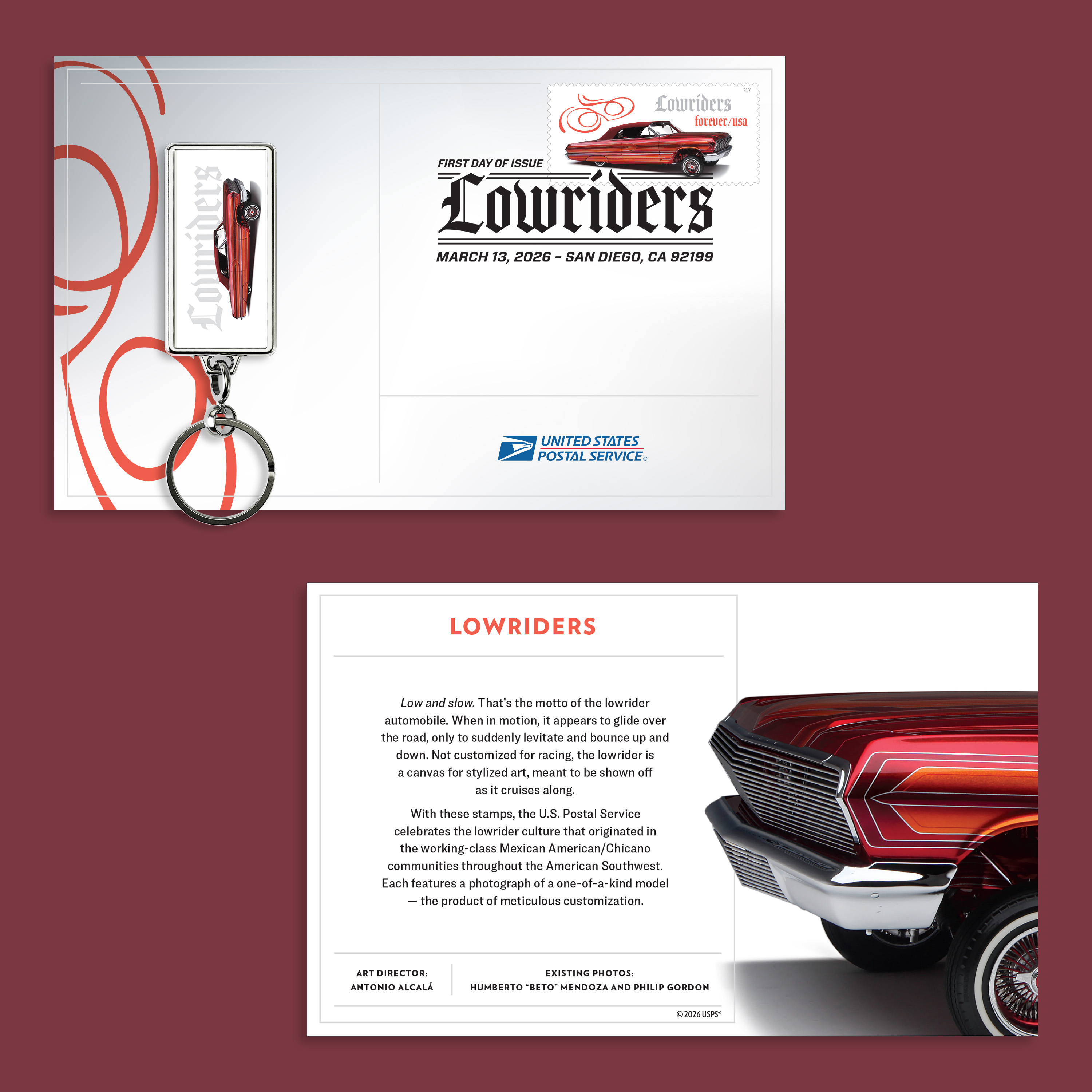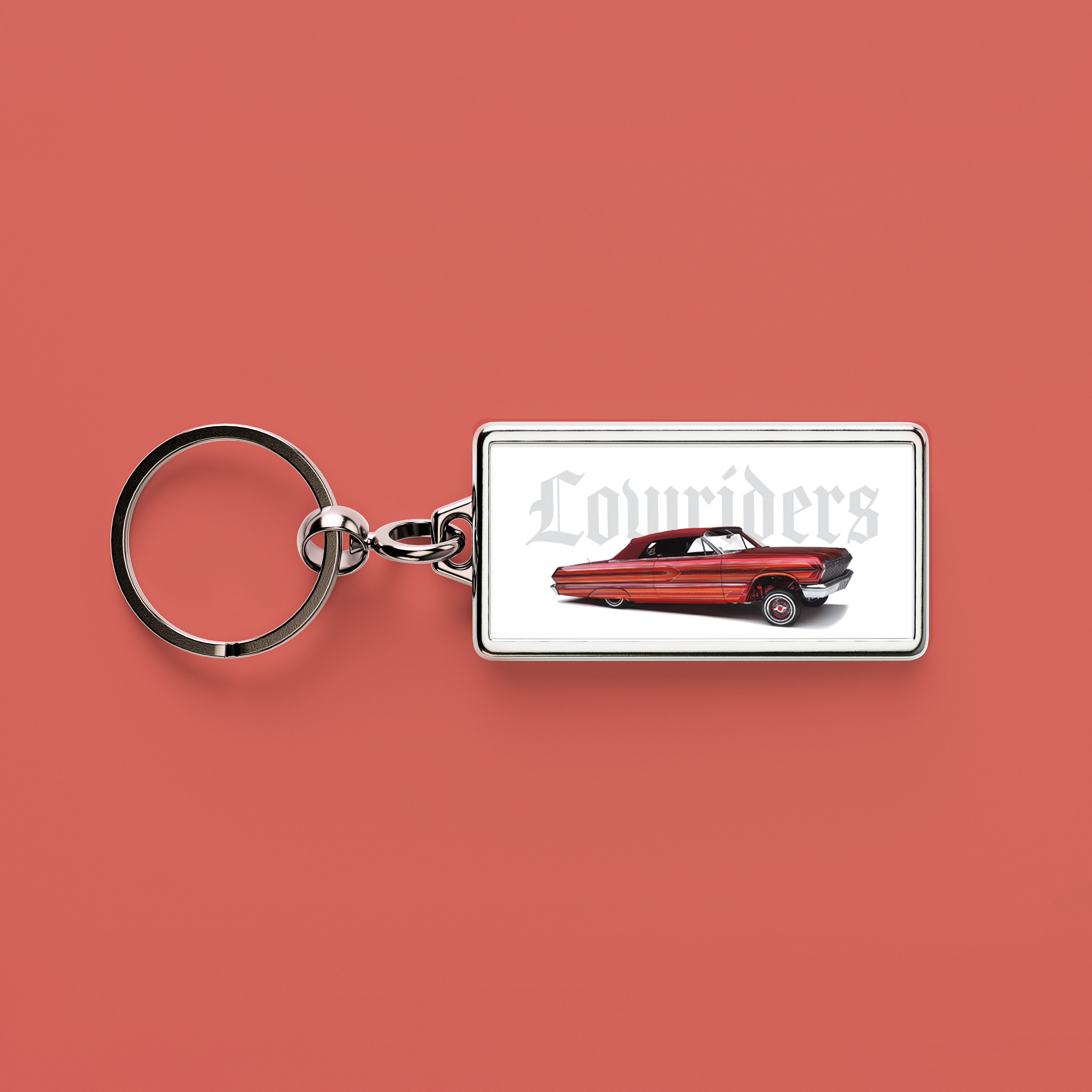 Outfit your keys with the Lowriders Keychain. The keychain highlights the red 1963 Impala from the stamp art.