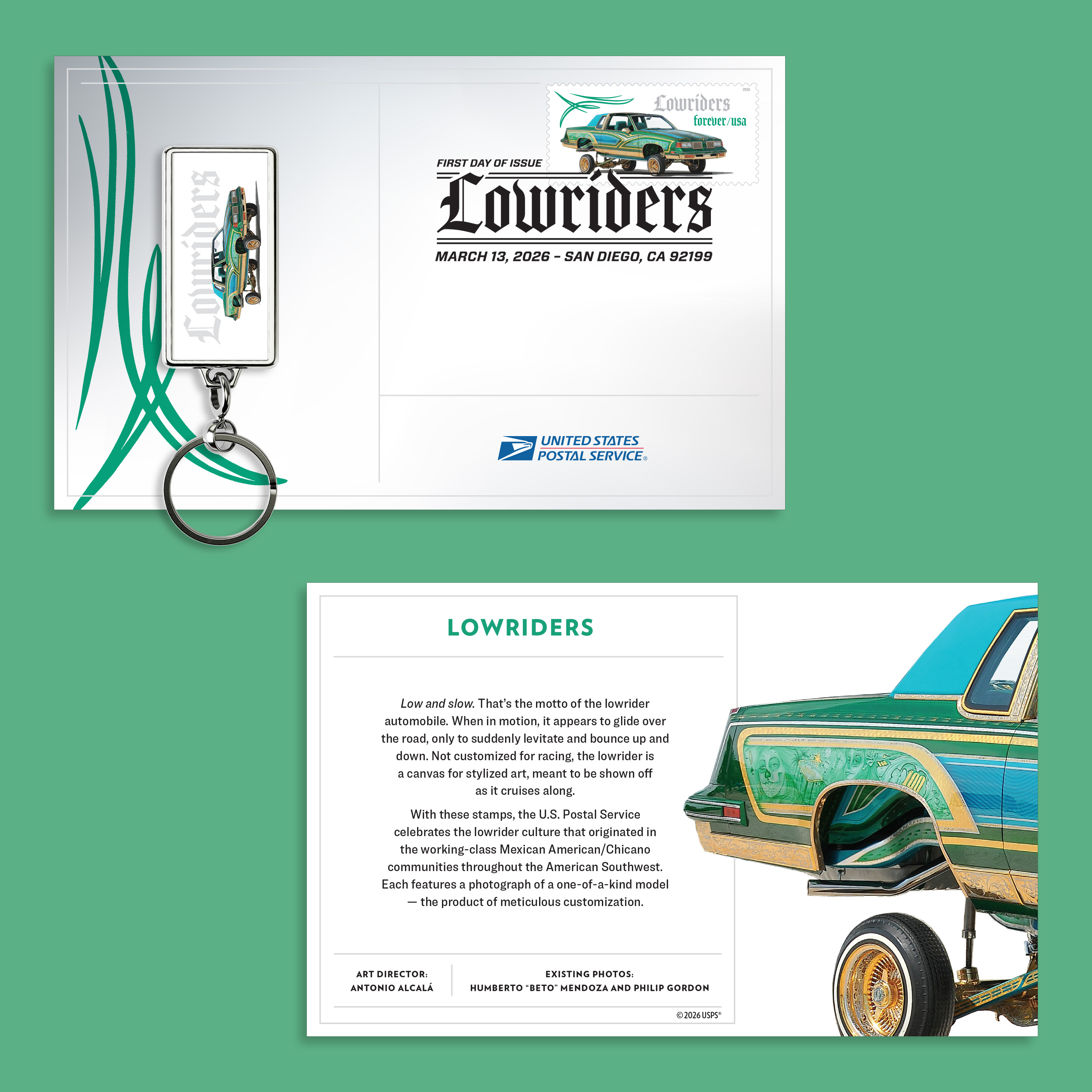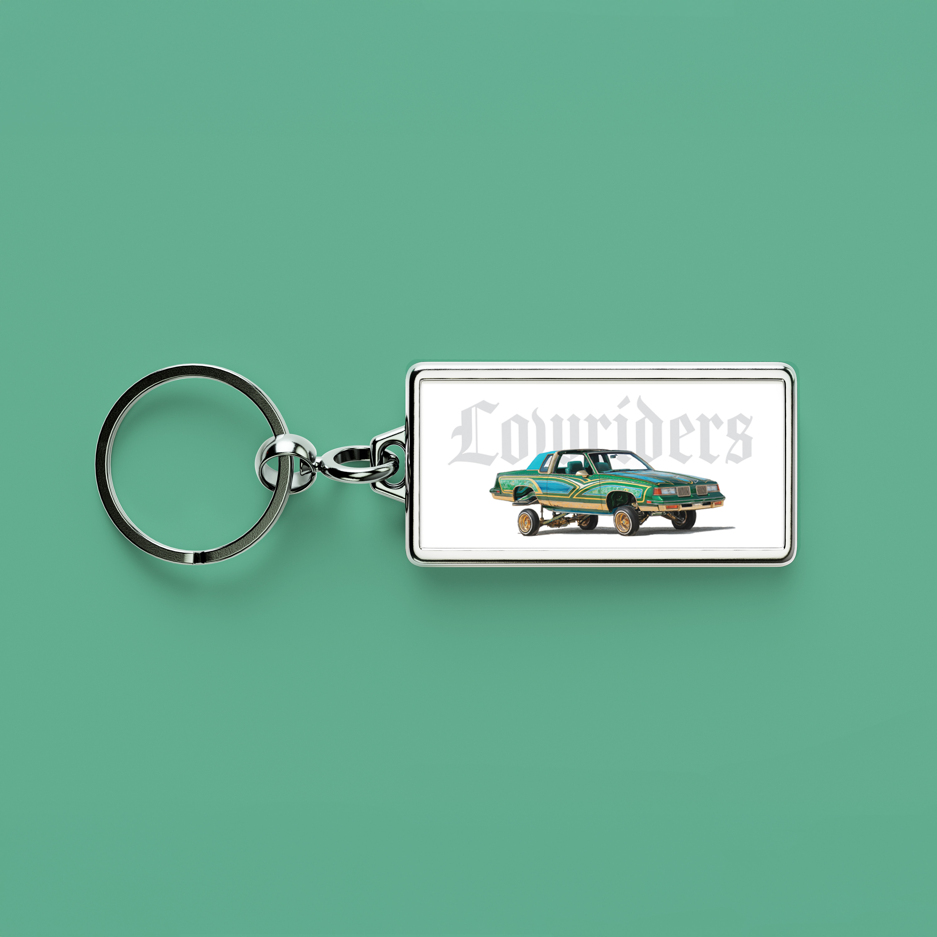 Outfit your keys with the Lowriders Keychain. The keychain highlights the green 1987 Cutlass Supreme from the stamp art.