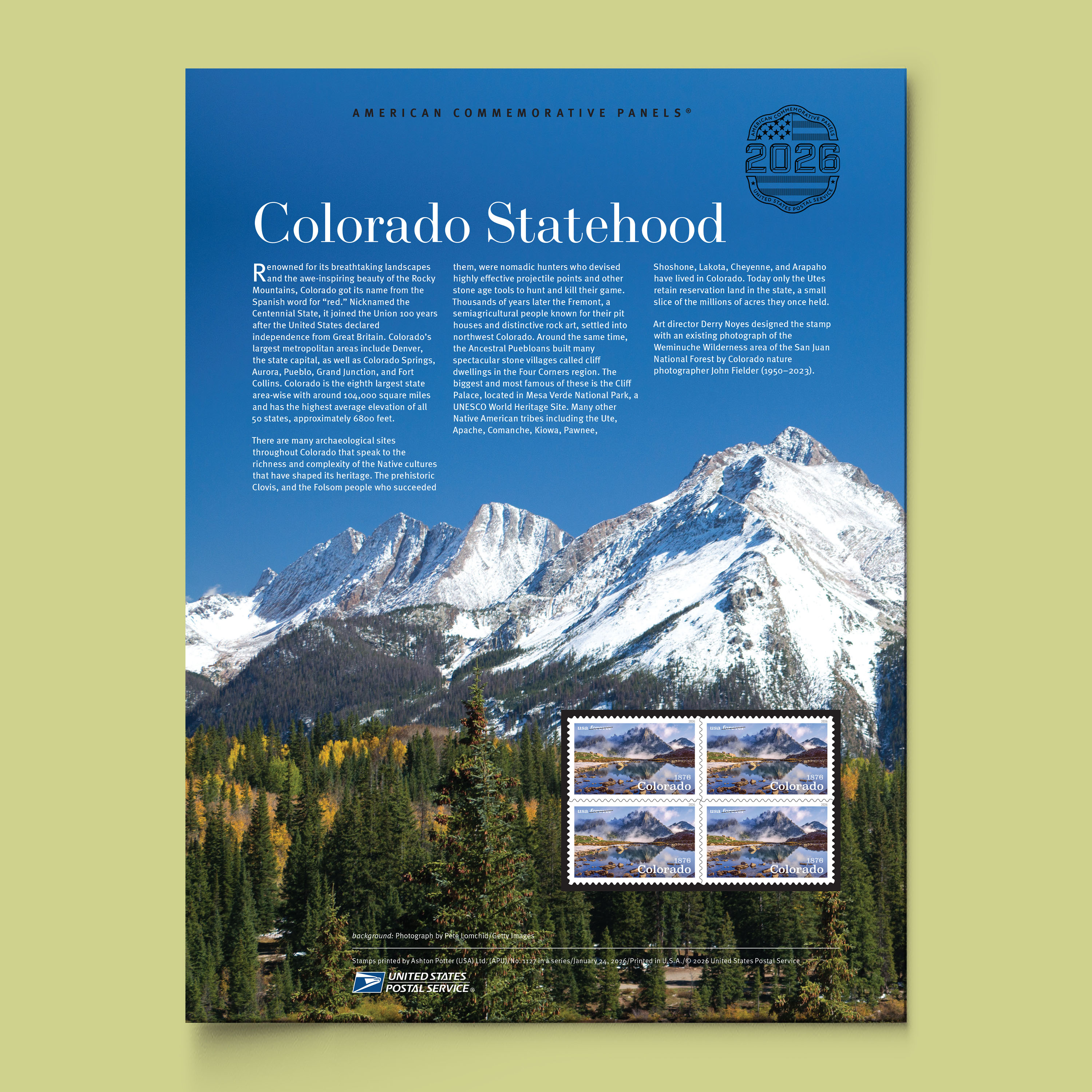 Appreciate a breathtaking mountain view and the release of these scenic stamps with the Colorado Statehood Commemorative Panel.