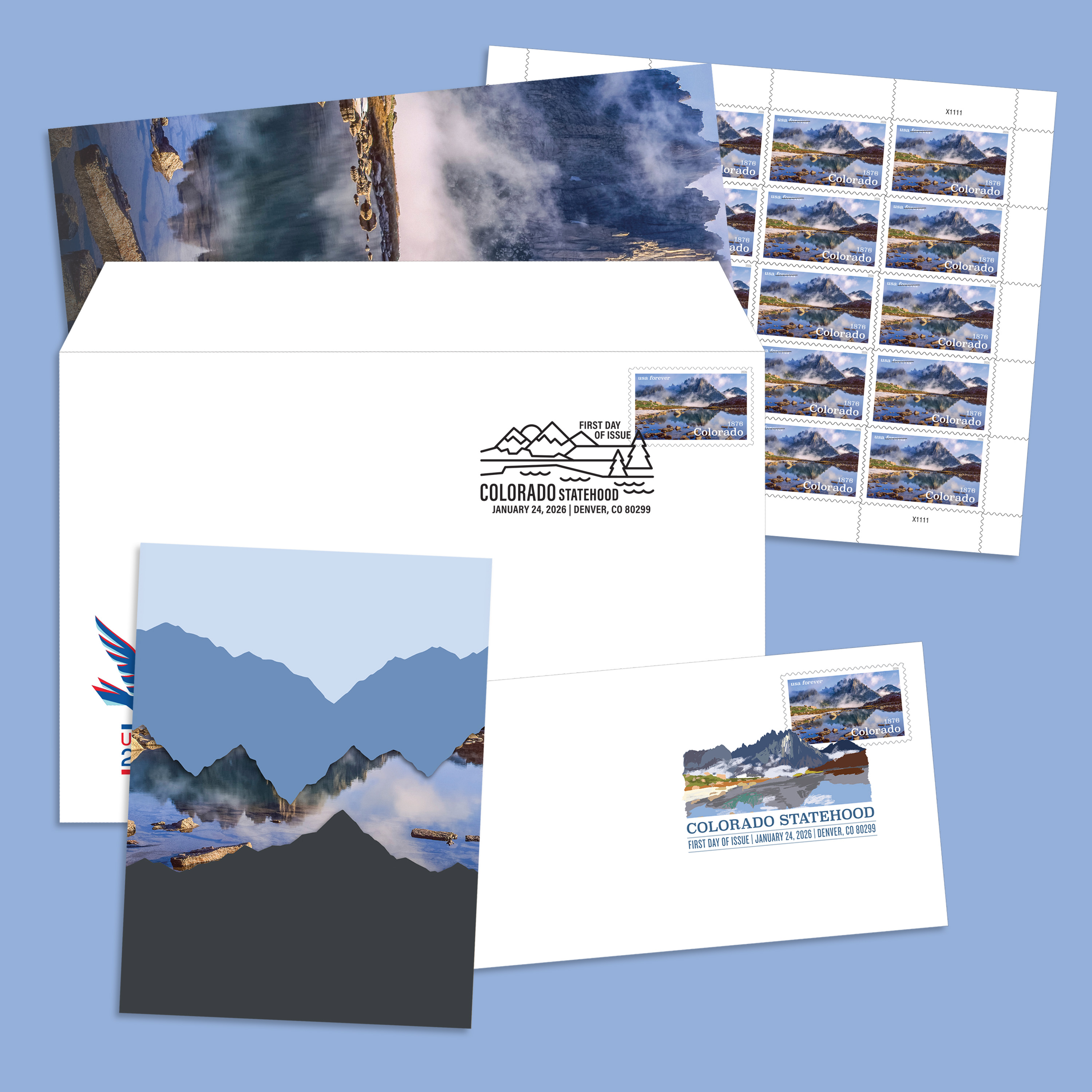 Appreciate a breathtaking mountain view with the Colorado Statehood Stamp Ceremony Memento. This collectible set commemorates the First Day of Issue for the Colorado Statehood Forever® stamp issuance.