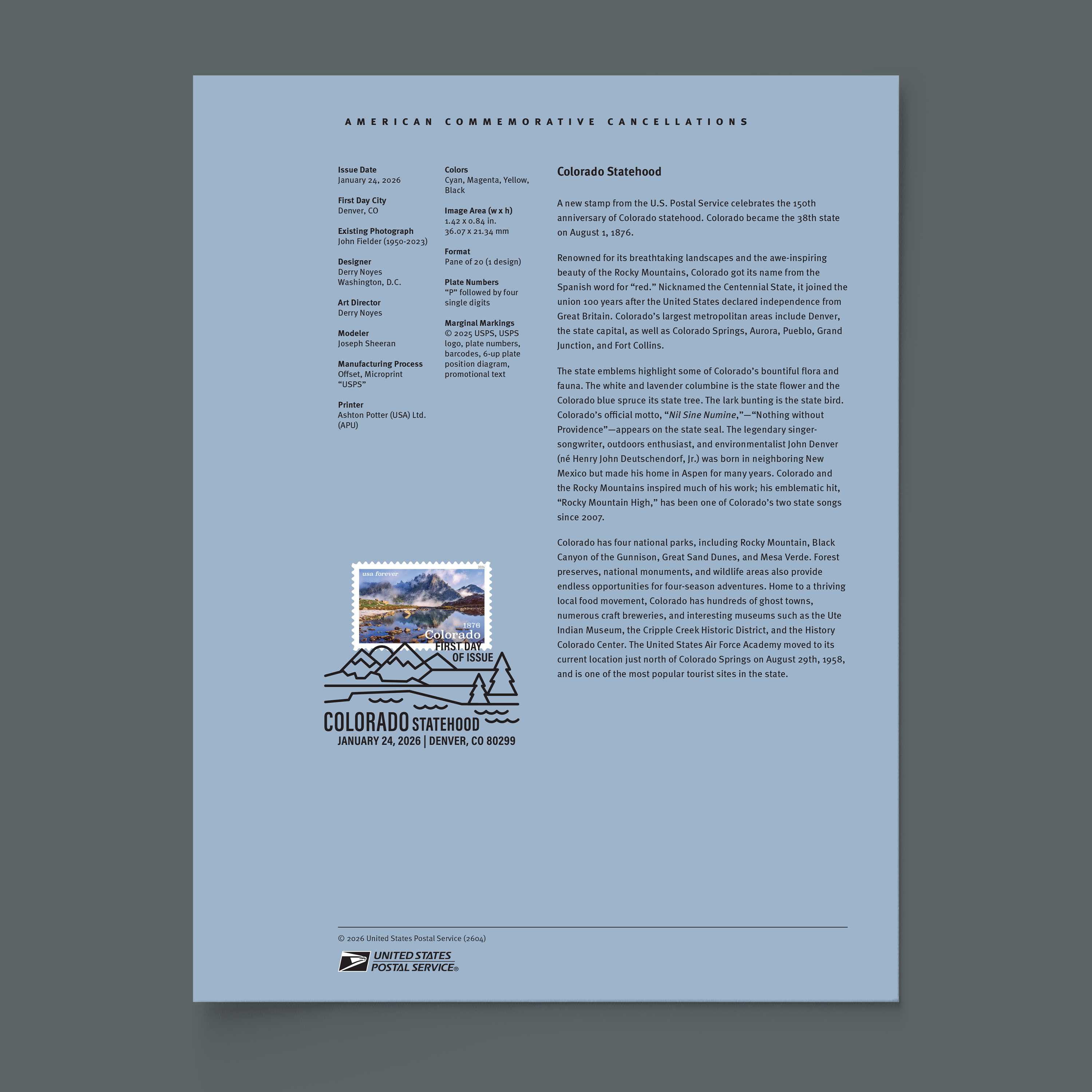 Appreciate a breathtaking mountain view and the release of these scenic stamps with the Colorado Statehood American Commemorative Cancellation Page. The stamps in this issuance feature a photograph of Jagged Mountain taken by Colorado nature photographer John Fielder.