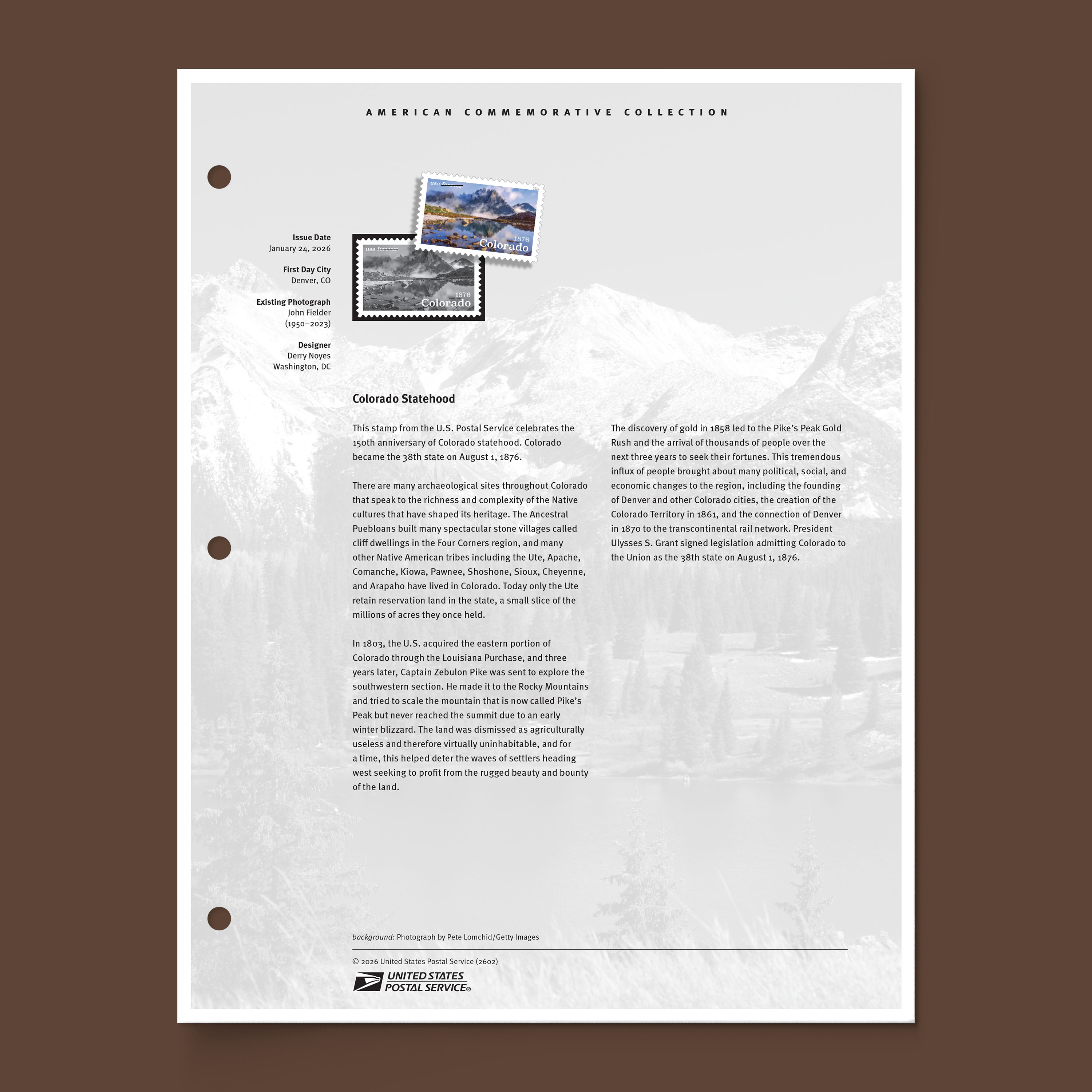 Appreciate a breathtaking mountain view and the release of these scenic stamps with the Colorado Statehood American Commemorative Collection Page. The stamps in this issuance feature a photograph of Jagged Mountain taken by Colorado nature photographer John Fielder.