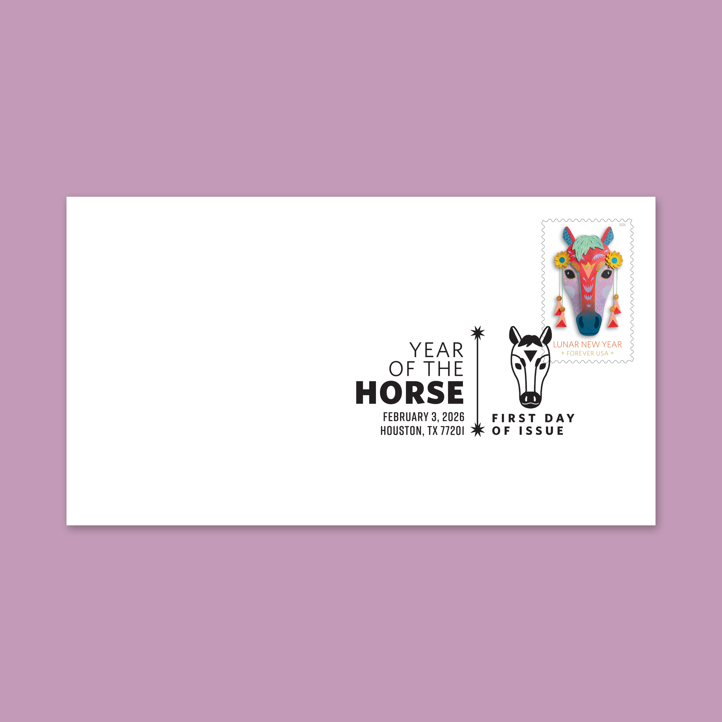 Ring in the new year with the Lunar New Year • Year of the Horse First Day Cover. The collectible envelope features a Lunar New Year • Year of the Horse Forever® stamp canceled with the official First Day of Issue postmark.