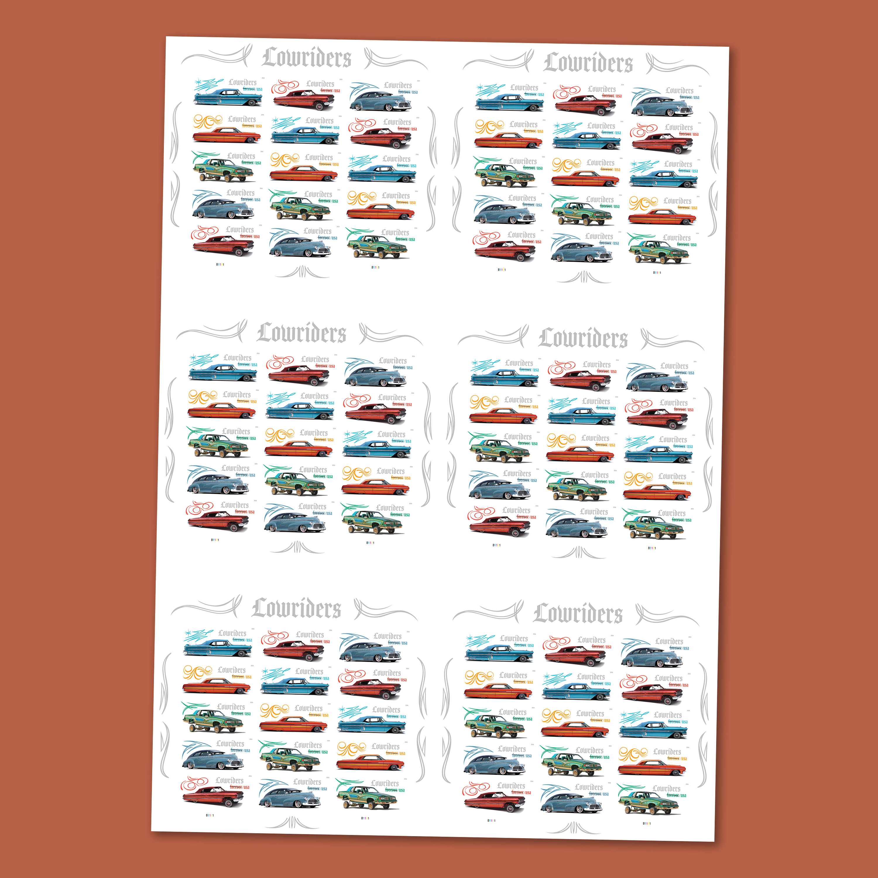 Celebrate a culture that originated in the working-class Mexican American/Chicano communities throughout the American Southwest with the Lowriders Press Sheet without Die Cuts. The press sheet does not include perforations and features the dazzling designs from the Lowriders Forever® stamp sheet.