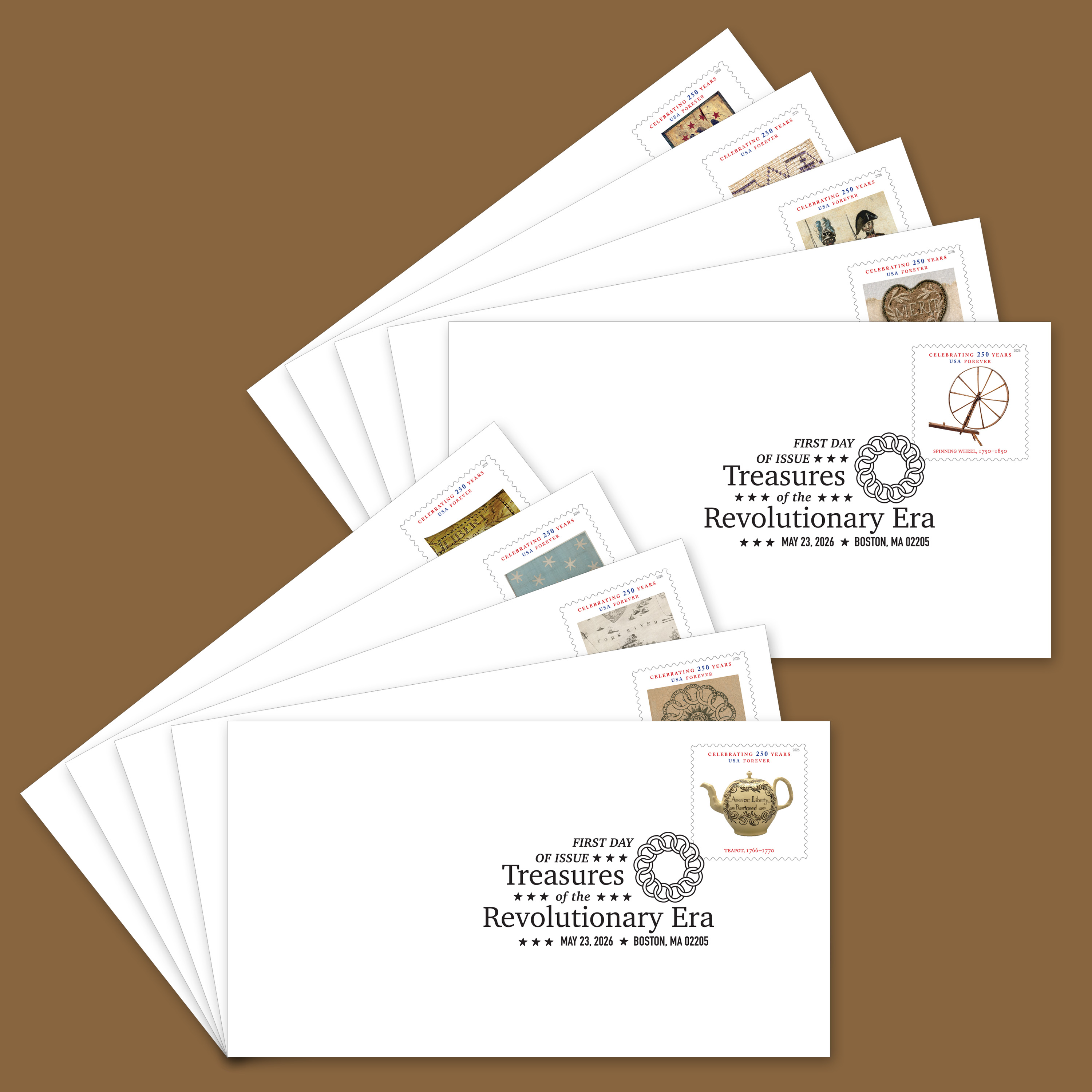 Experience the symbols and stories that helped shape the United States with these Treasures of the Revolutionary Era First Day Covers. Each collectible envelope in the set of 10 has an affixed Forever® stamp canceled with the official First Day of Issue postmark.