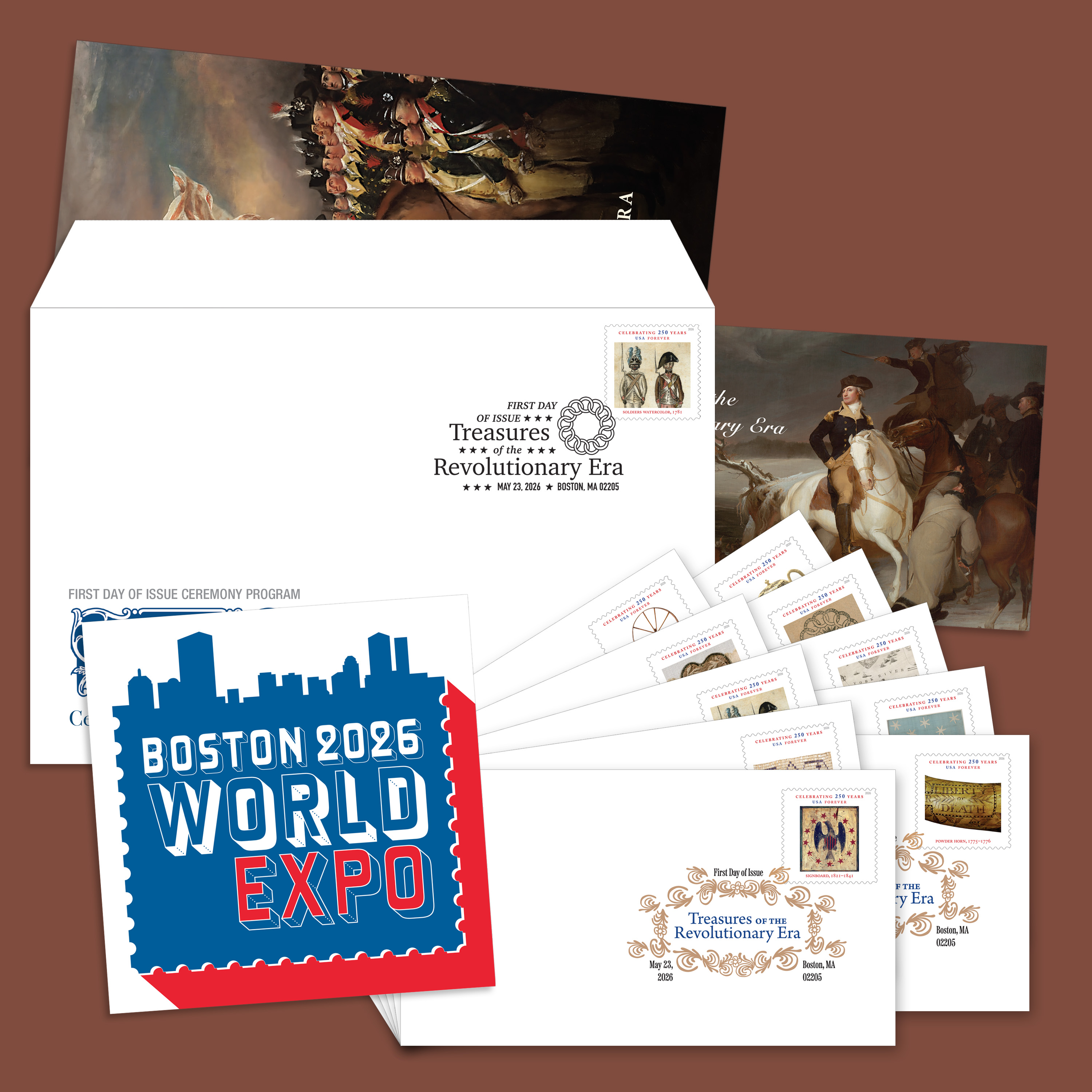 Experience the symbols and stories that helped shape the United States with these Treasures of the Revolutionary Era Stamp Ceremony Memento. This collectible set commemorates the First Day of Issue for the Treasures of the Revolutionary Era Forever® stamps.