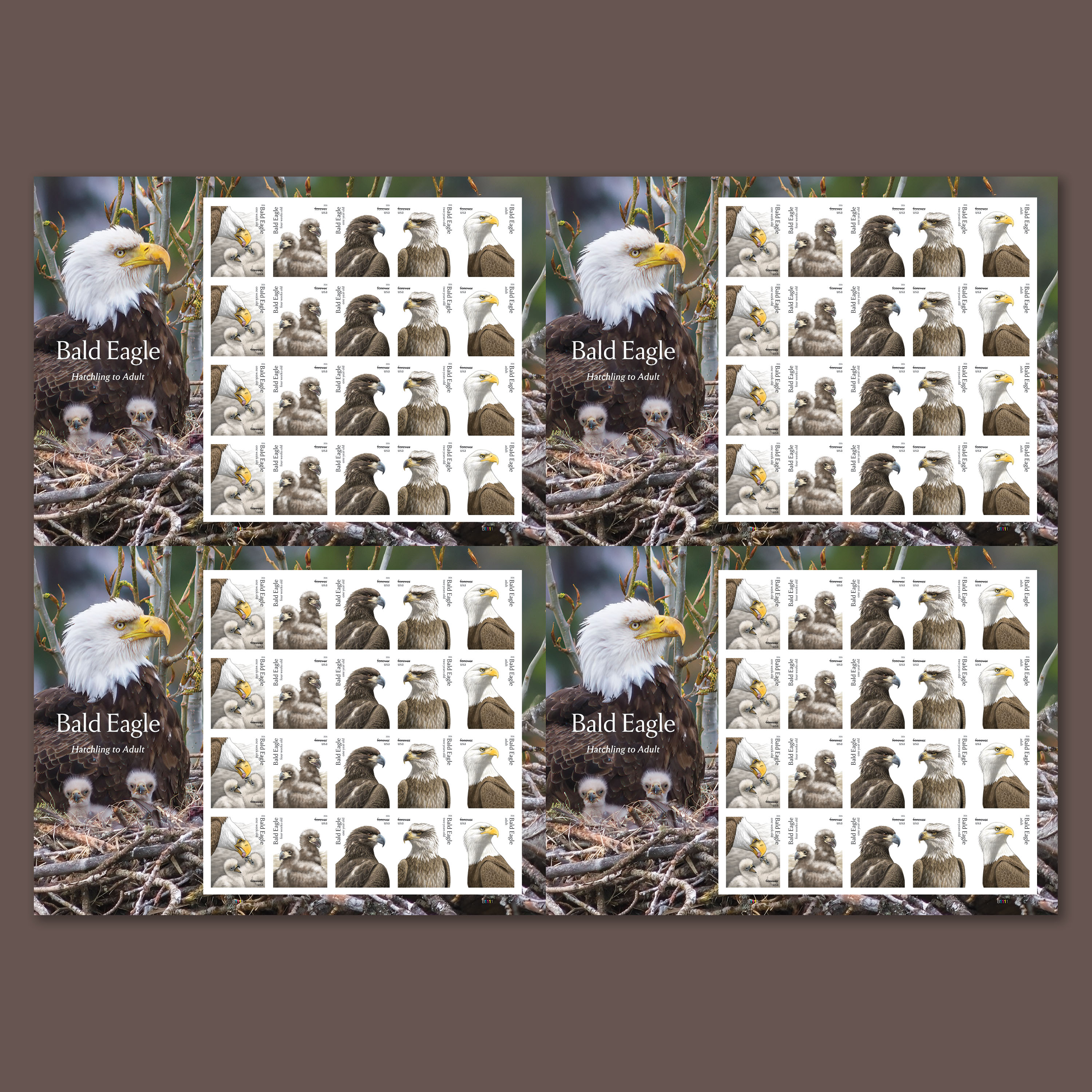 Honor the majesty of our national bird with the Bald Eagle: Hatchling to Adult  Press Sheet without Die Cuts. The press sheet does not include perforations and features the designs from the Bald Eagle: Hatchling to Adult Forever® stamp sheet.