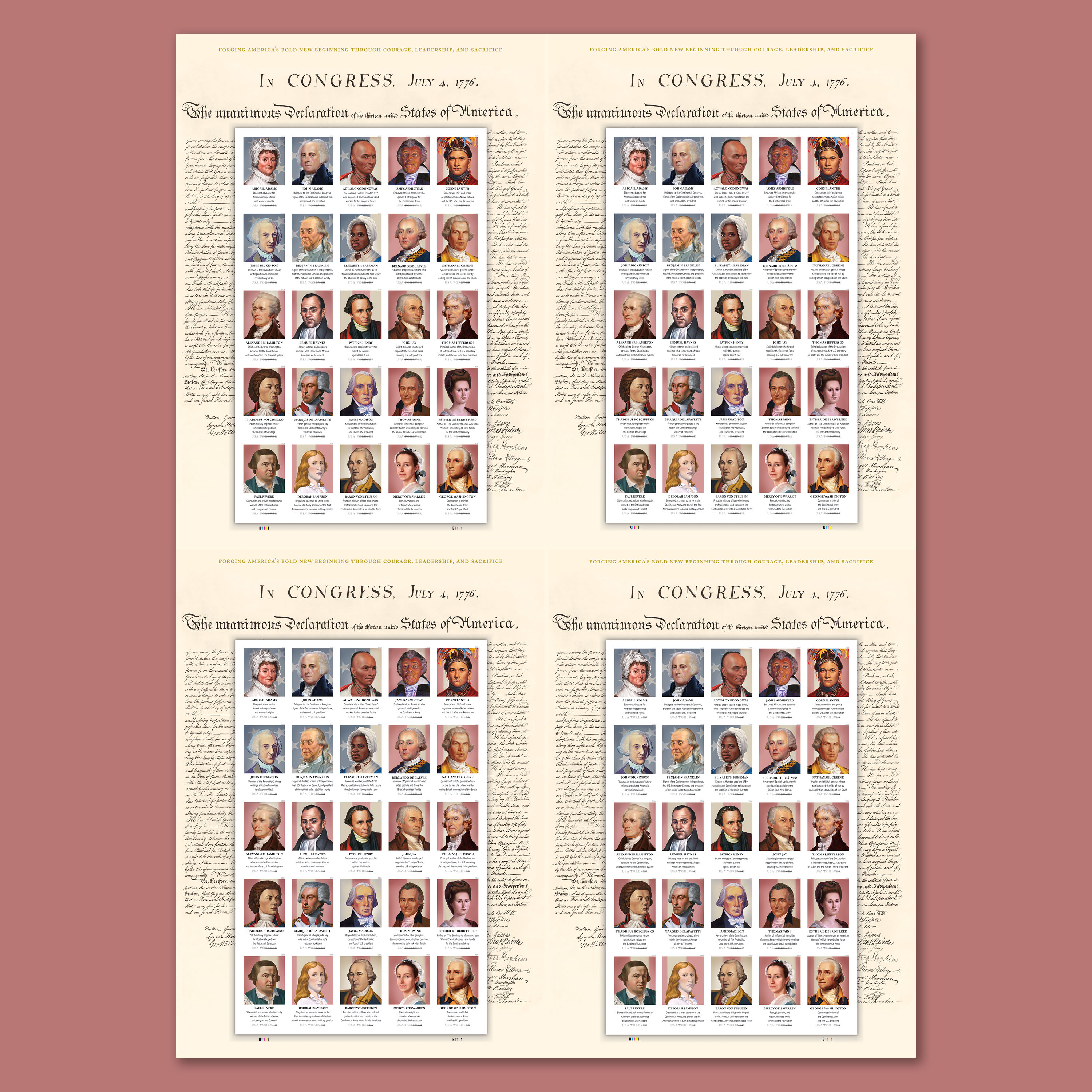 Honor the courage, convictions, and sacrifices of the people who shaped the American Revolution and its enduring legacy with the Figures of the American Revolution Press Sheet without Die Cuts. The press sheet does not include perforations and features the designs from the Figures of the American Revolution Forever® stamp sheet.