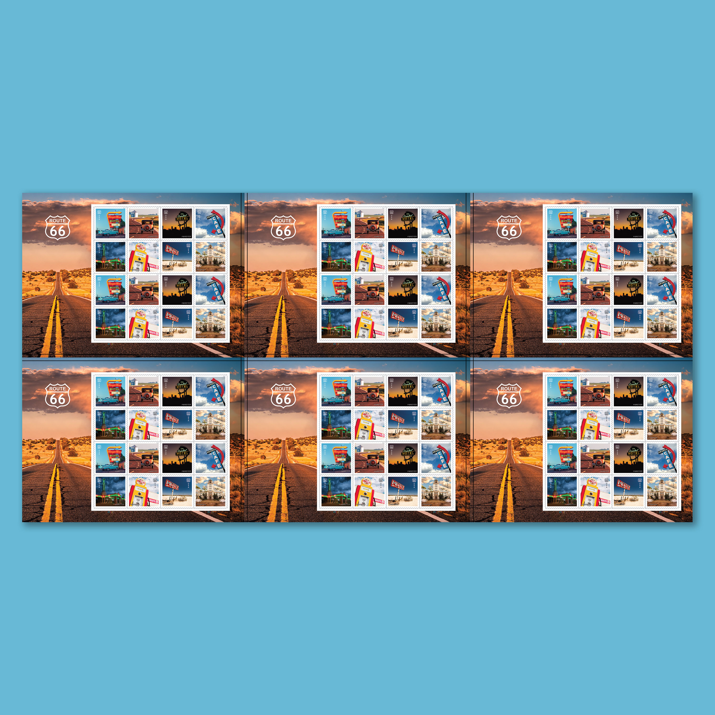 Celebrate the 100th anniversary of America’s legendary highway with this Route 66 Press Sheet with Die Cuts. The press sheet includes perforations and features the designs from the Route 66 Forever® stamp sheet.