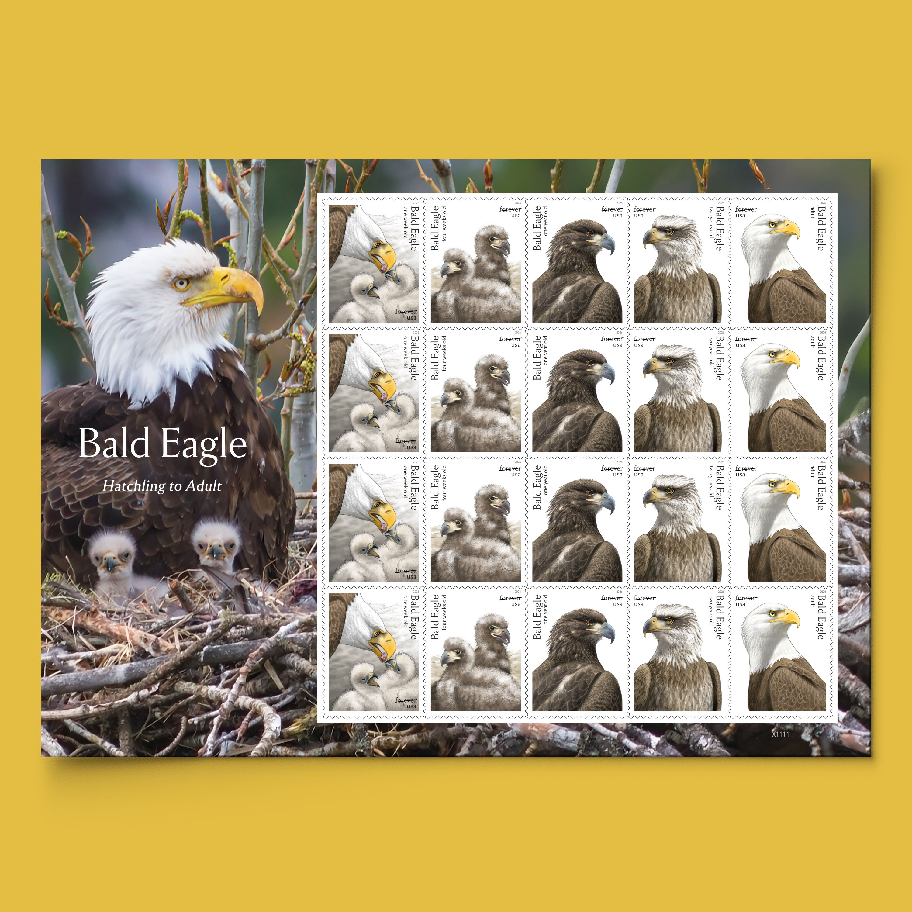 Honor the majesty of our national bird with the Bald Eagle: Hatchling to Adult Forever® stamps. Available in panes of 20, the stamps feature 5 designs.