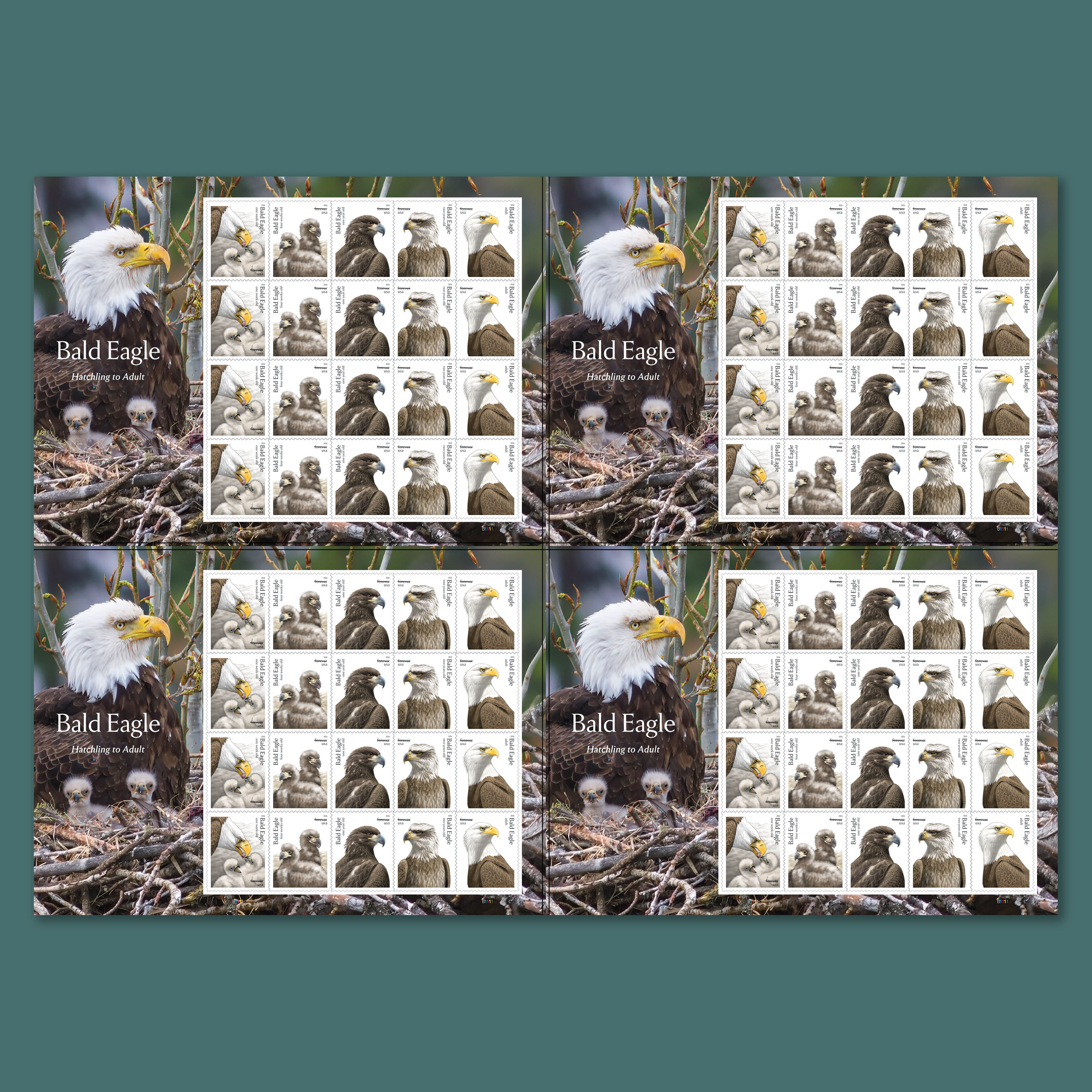 Honor the majesty of our national bird with the Bald Eagle: Hatchling to Adult Press Sheet with Die Cuts. The press sheet includes perforations and features the designs from the Bald Eagle: Hatchling to Adult Forever® stamp sheet.