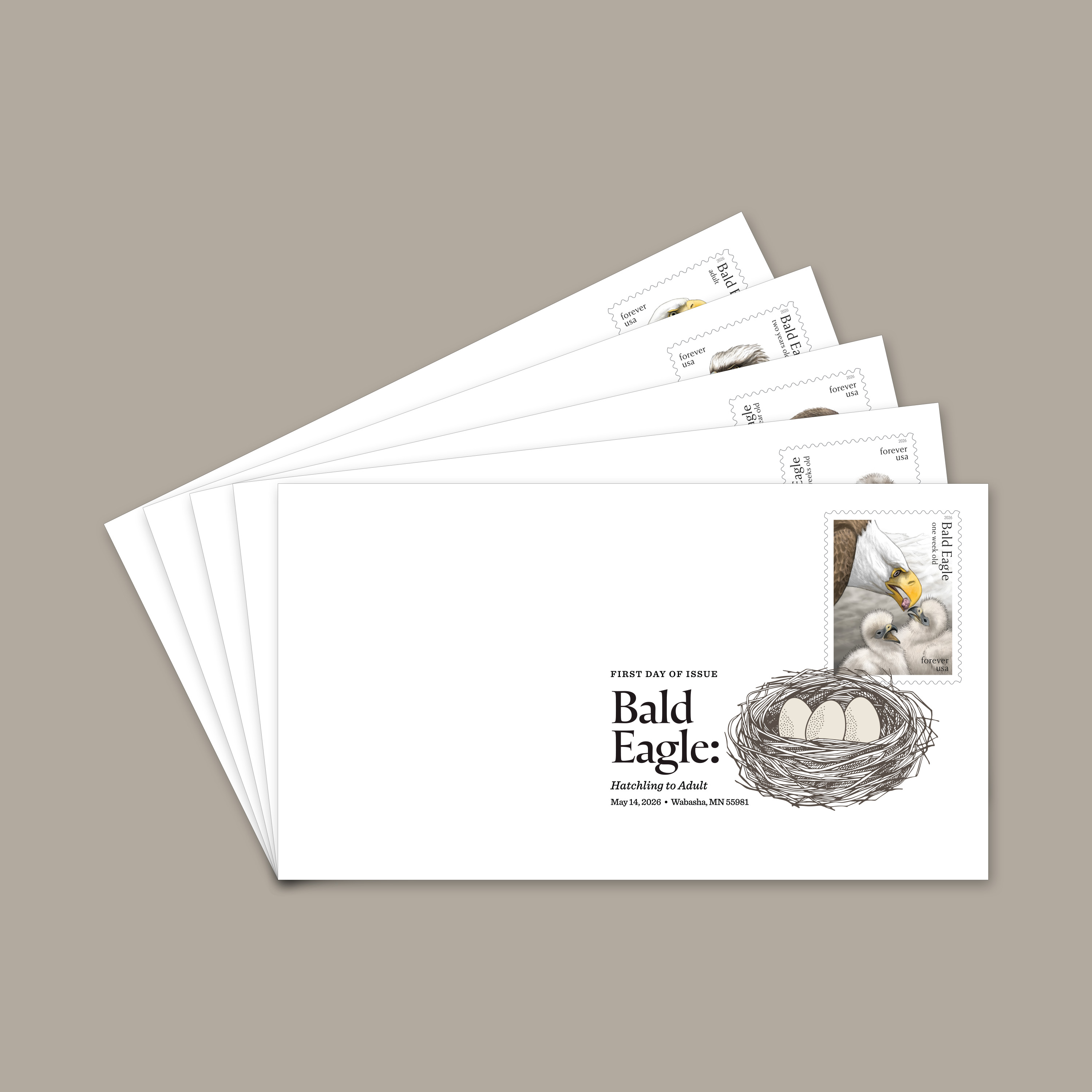 Honor the majesty of our national bird with the Bald Eagle: Hatchling to Adult Digital Color Postmarks. Each of the collectible envelopes in this set of 5 features a full-color postmark canceling the Bald Eagle: Hatchling to Adult Forever® stamps — the perfect keepsake for birdwatchers and collectors alike.