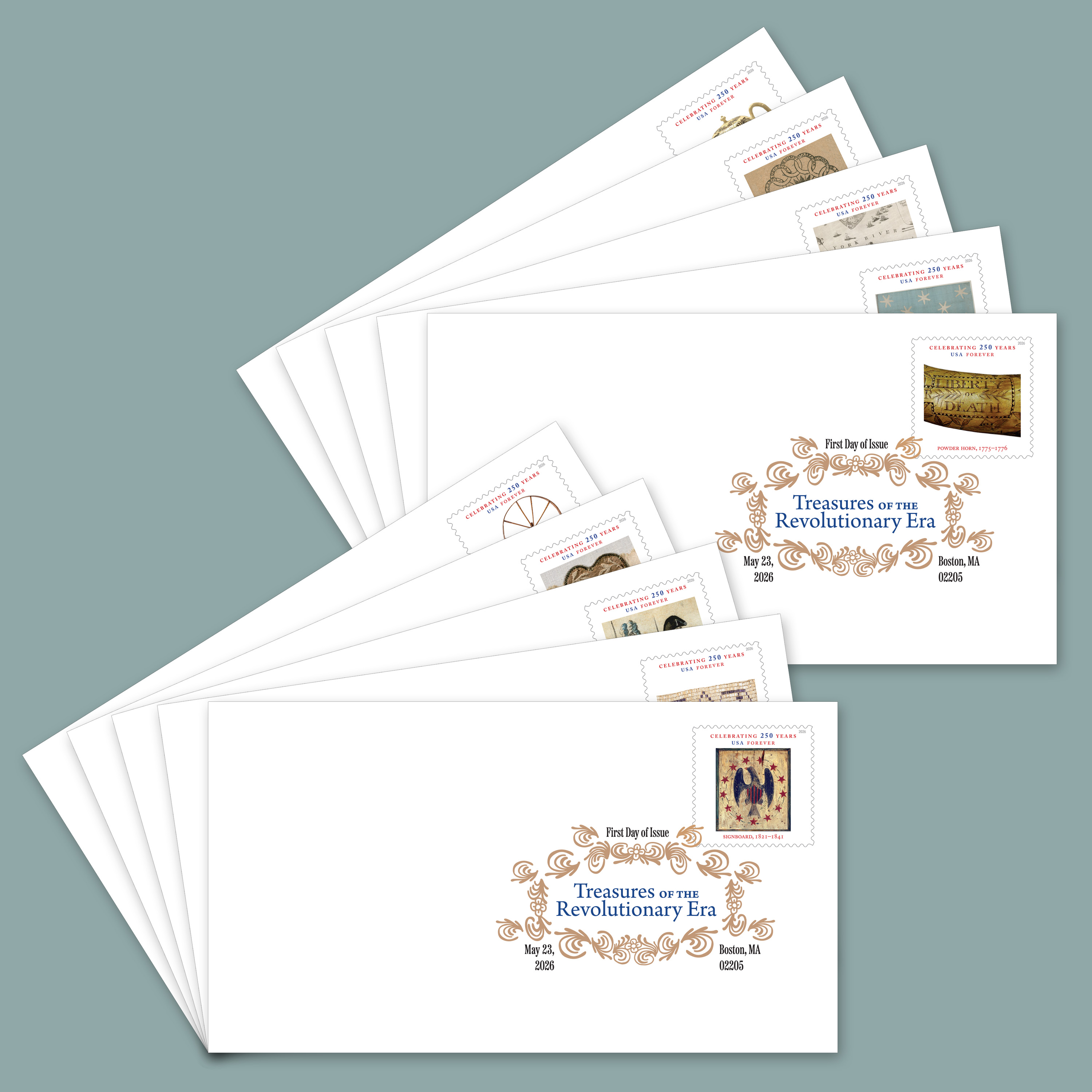 Experience the symbols and stories that helped shape the United States with these Treasures of the Revolutionary Era Digital Color Postmarks. Each of the collectible envelopes in this set of 10 features a full-color postmark canceling a Treasures of the Revolutionary Era Forever® stamp — the perfect keepsake for travelers and collectors alike.