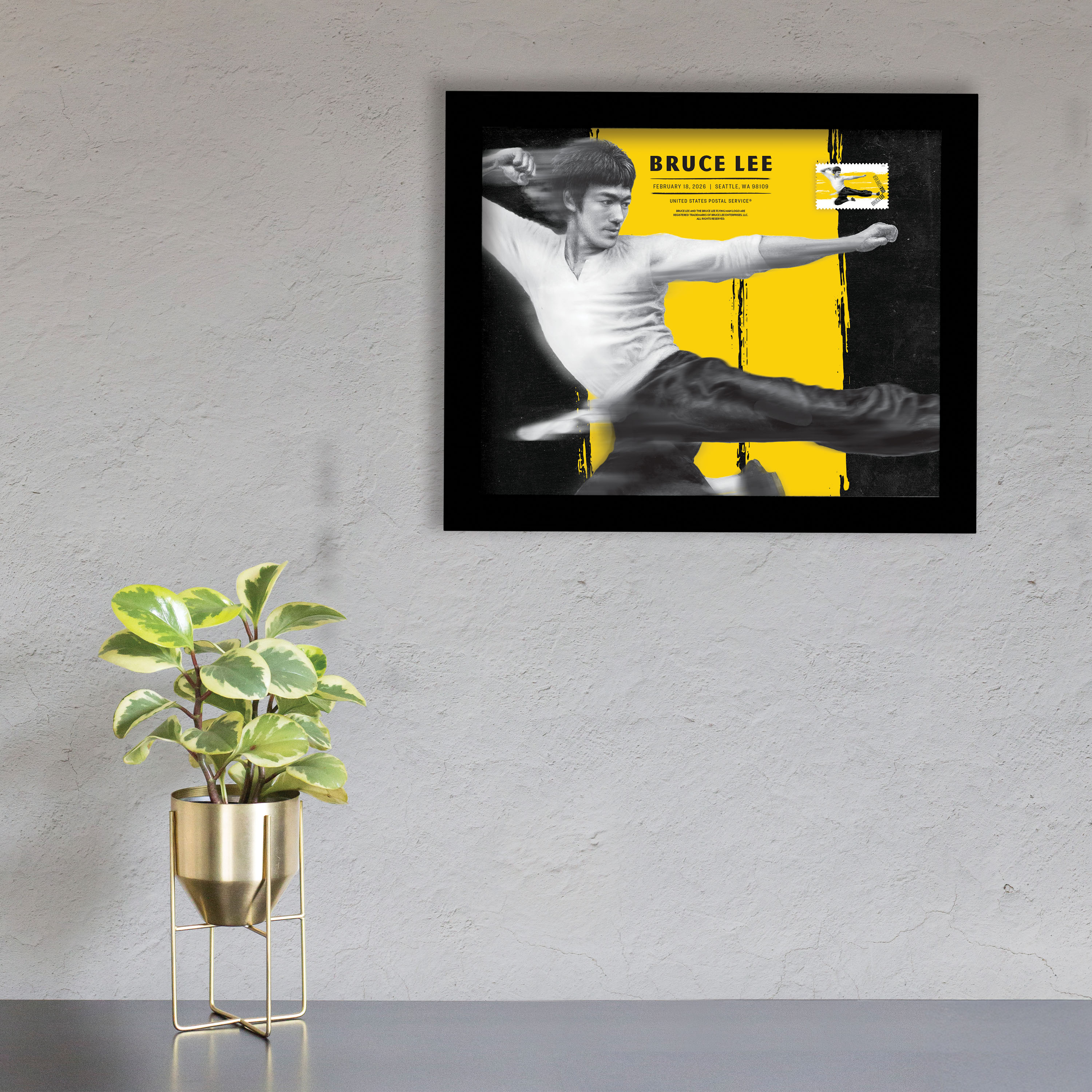 Level up your space add this striking Bruce Lee Framed Stamp to your collection. This stamp celebrates the Chinese American martial artist, actor, and filmmaker who inspired generations.