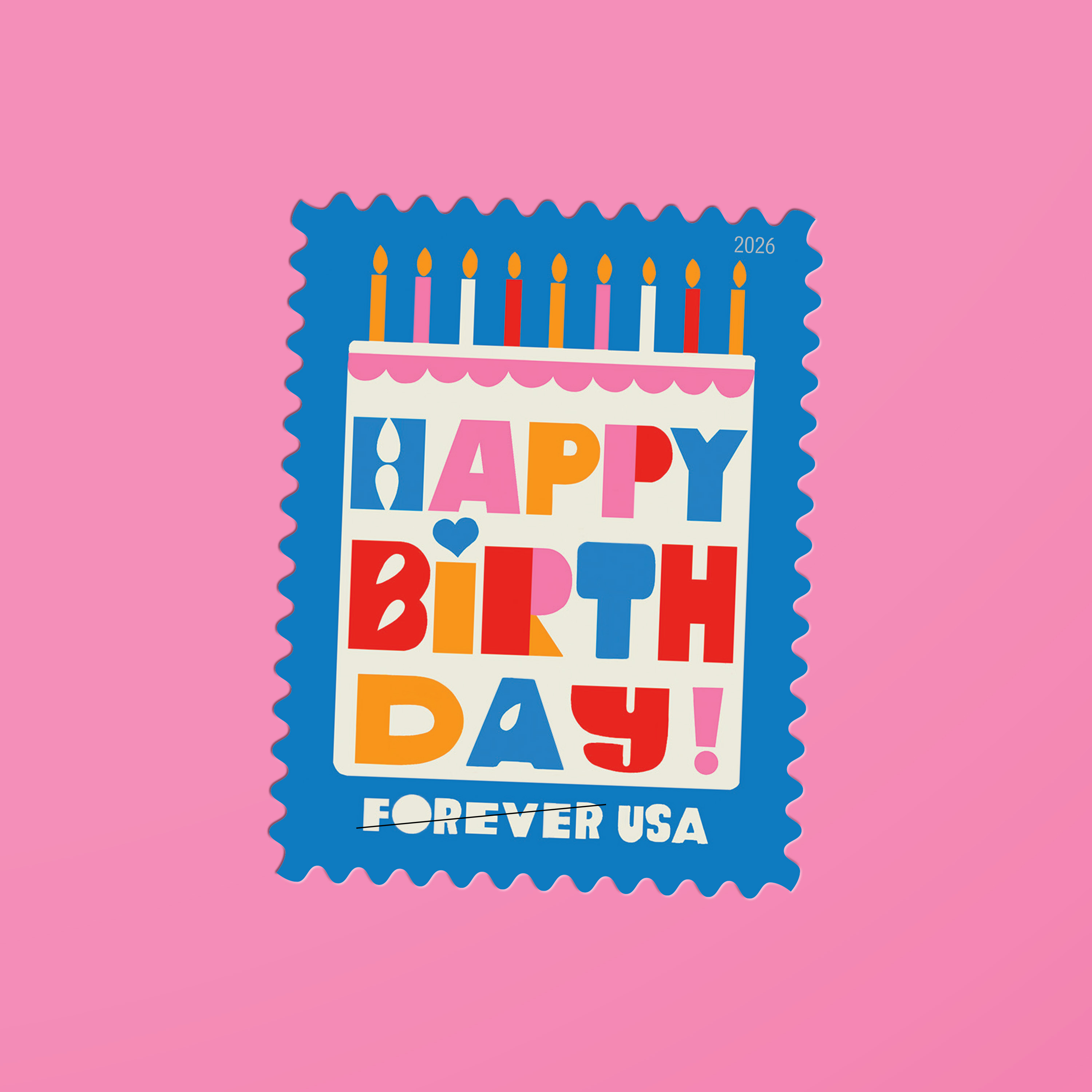 “I think the simple but graphic birthday cake works so well at stamp size,” Breeding says. “That Lisa was able to design the lettering in a fun way inside the cake feels fresh and inviting.”