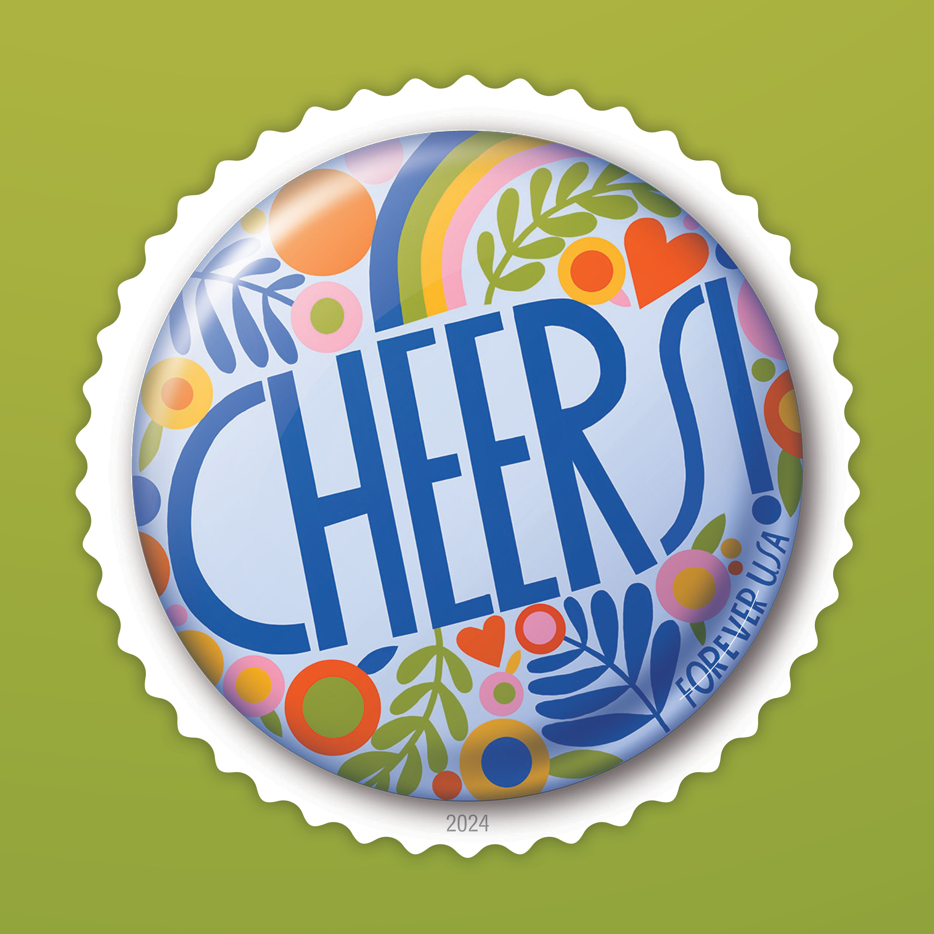 While that birthday party was a surprise, Congdon shouldn’t have been surprised by being asked to create the art for the new Happy Birthday stamp after her work on the Cheers! design for the award-winning Pinback Buttons (2024) stamp issuance.