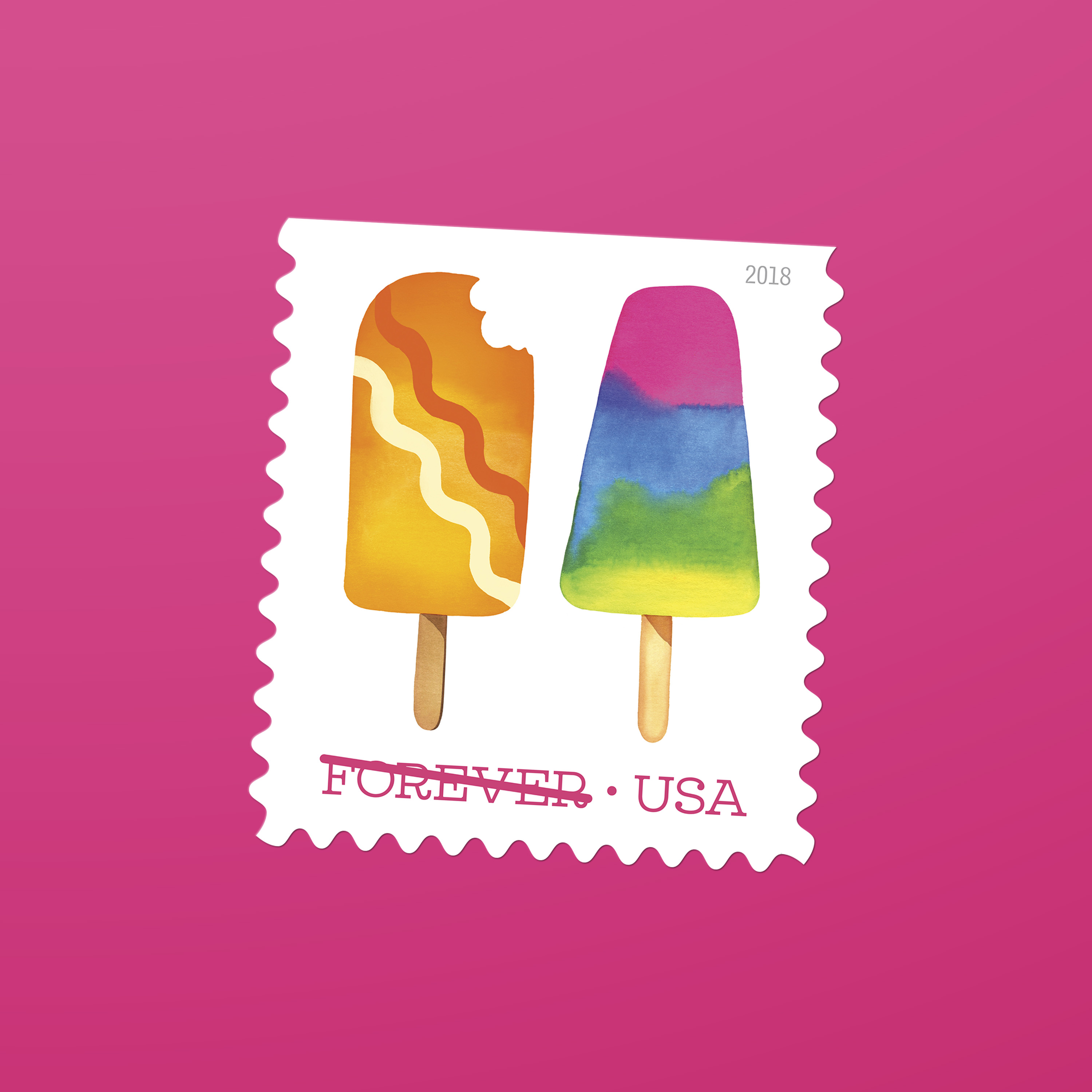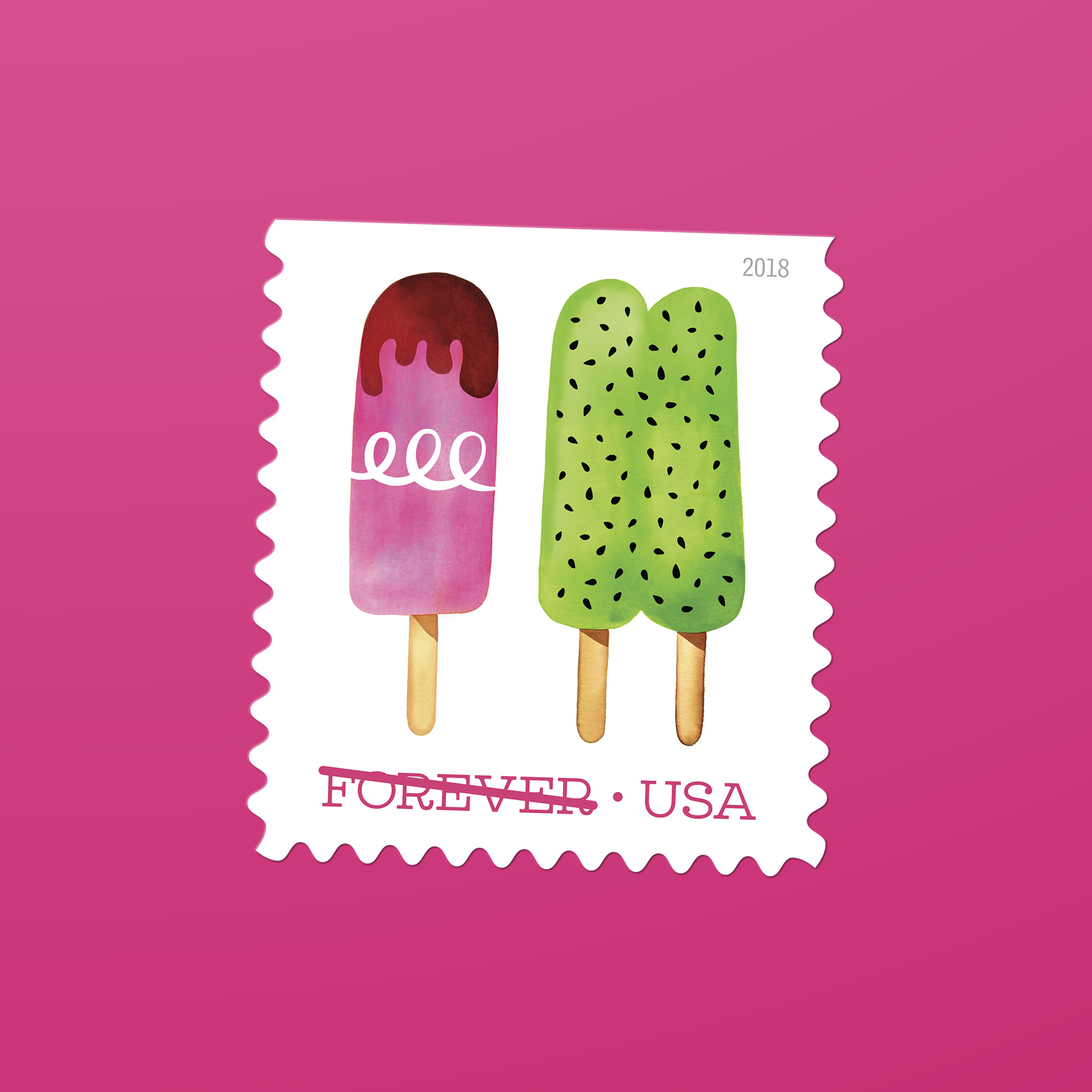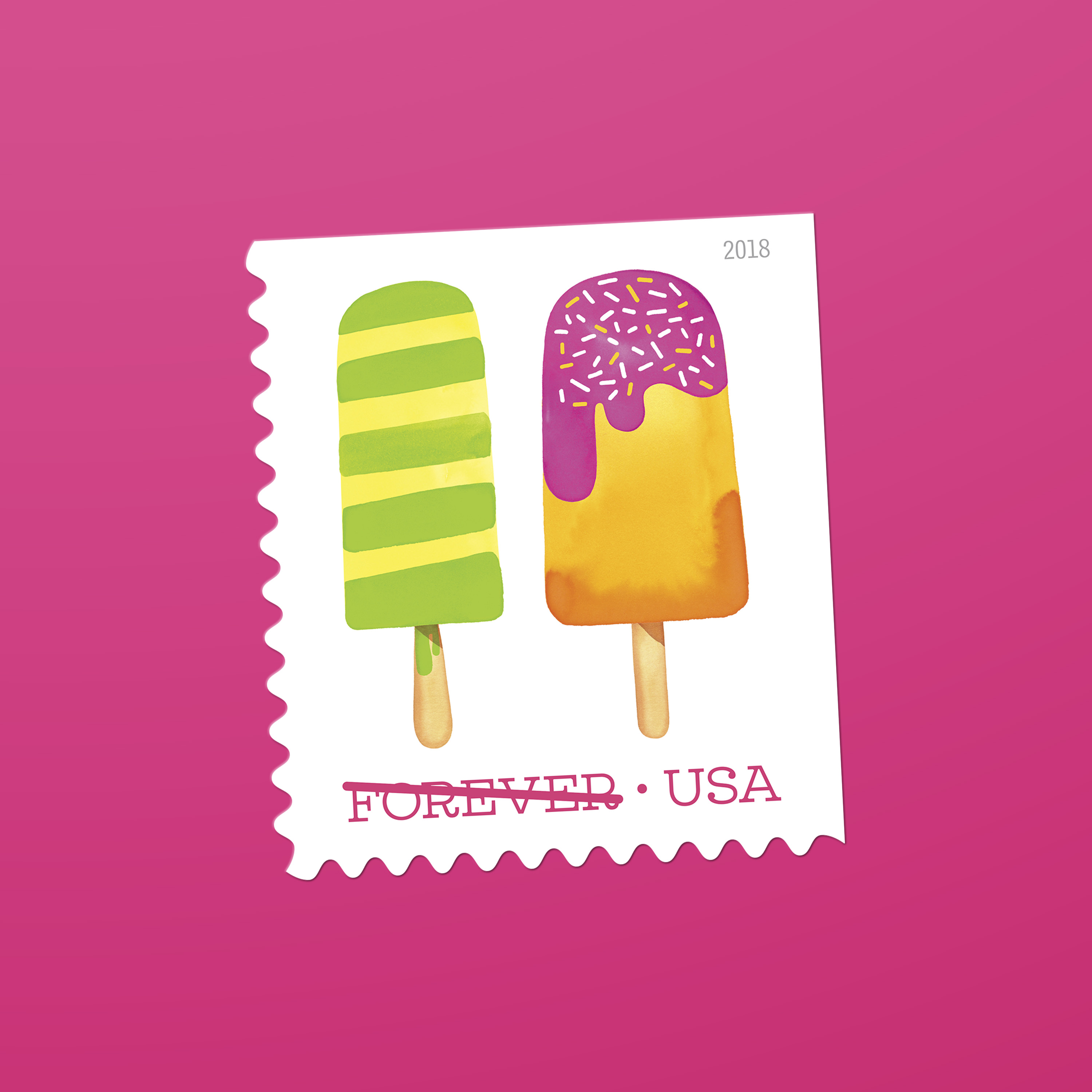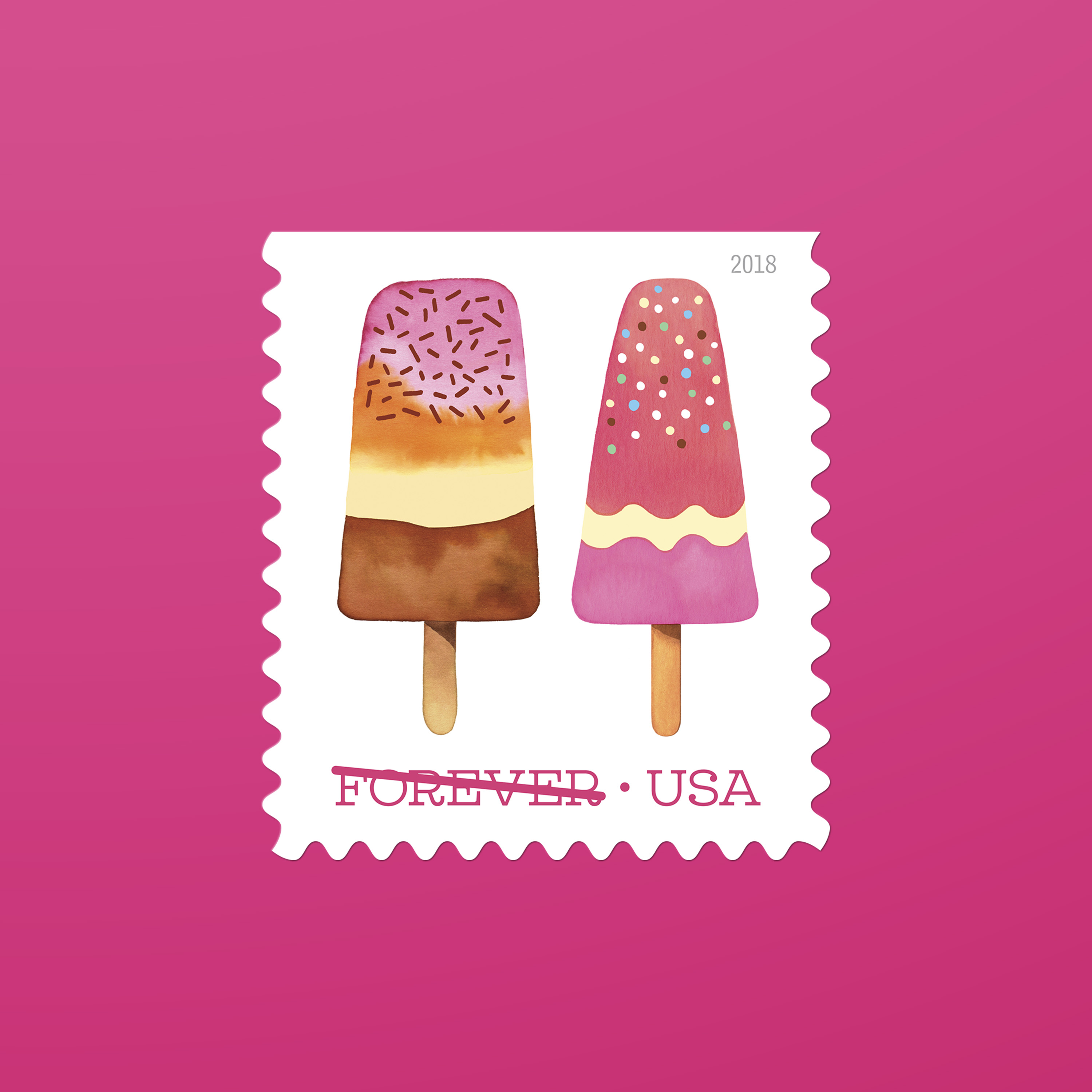 In 2018, the U.S. Postal Service issued its first — and so far only — scratch-and-sniff stamps. Frozen Treats, featuring Magrikie Berg’s whimsical watercolor illustrations of colorful, frosty pops on a stick, smelled as good as they looked. “The printer offered us a selection of fragrances, and we chose one that we felt was most reminiscent of the sweet scent of summer,” Duefrene explains.