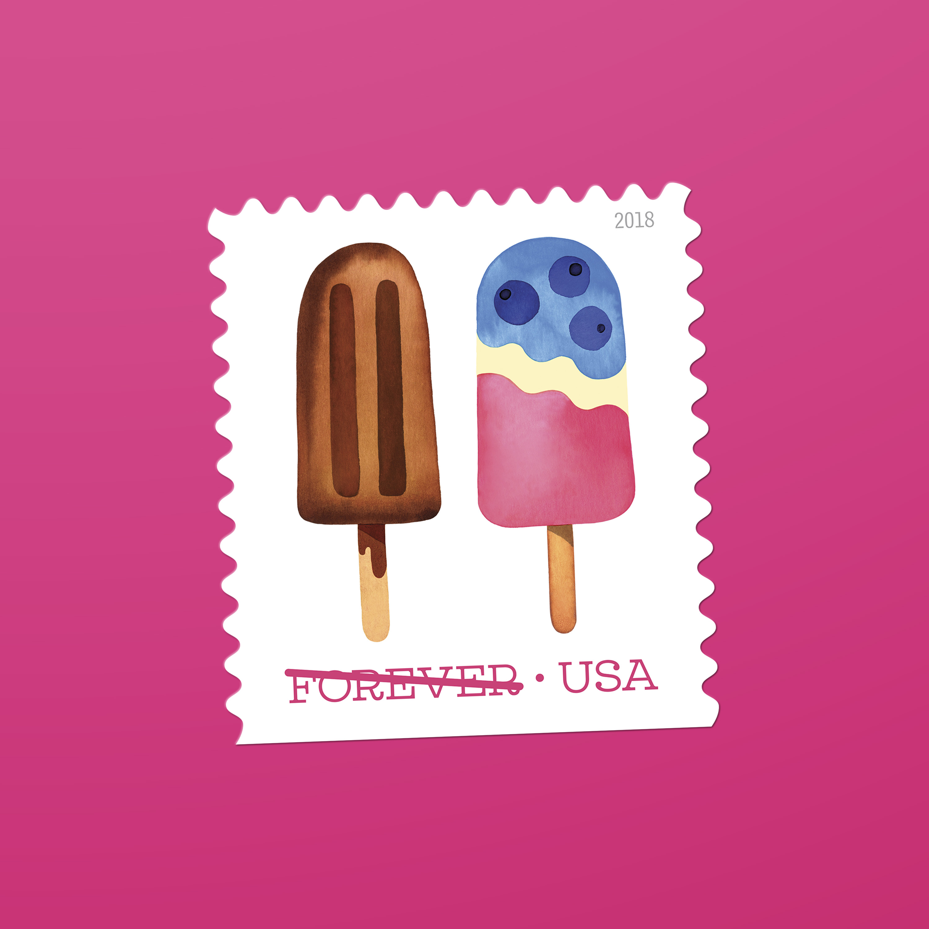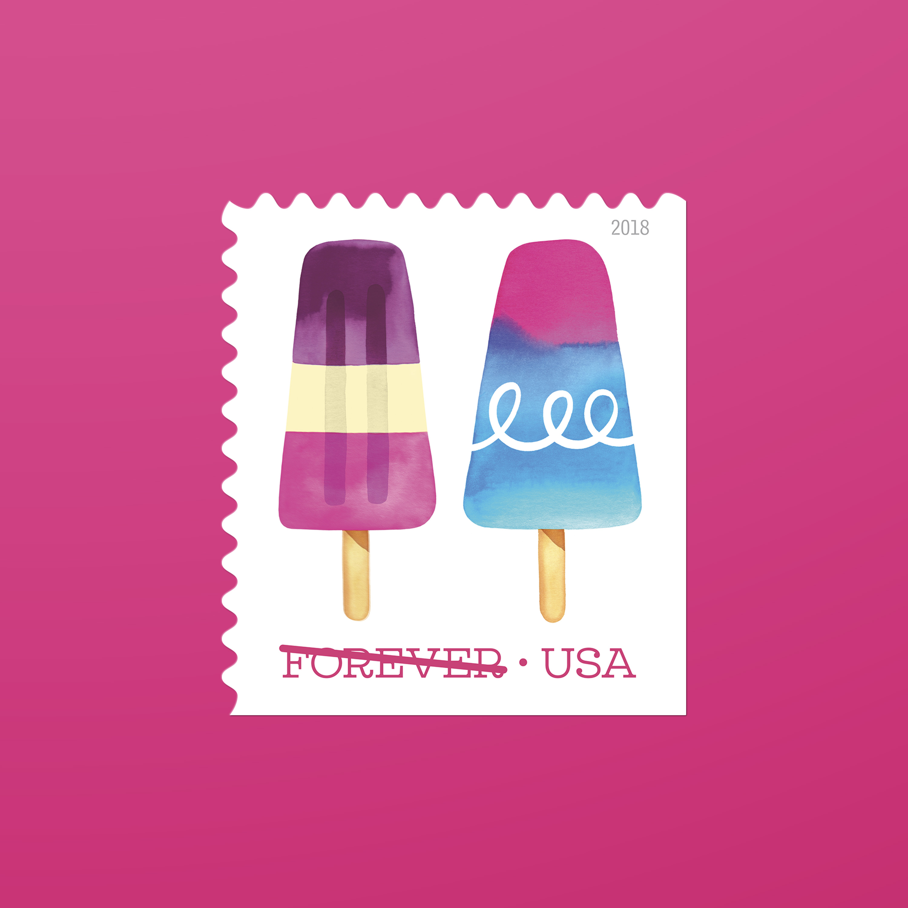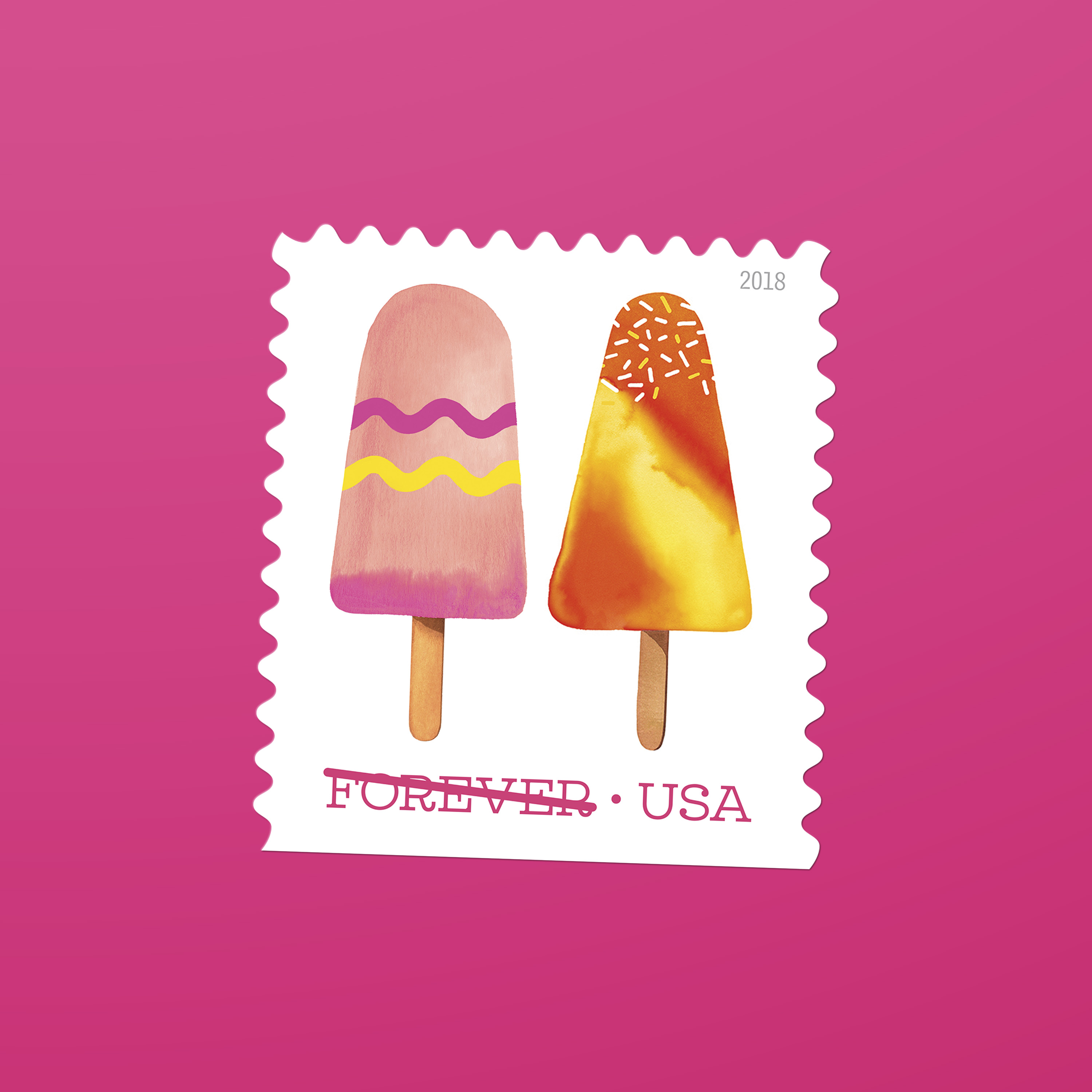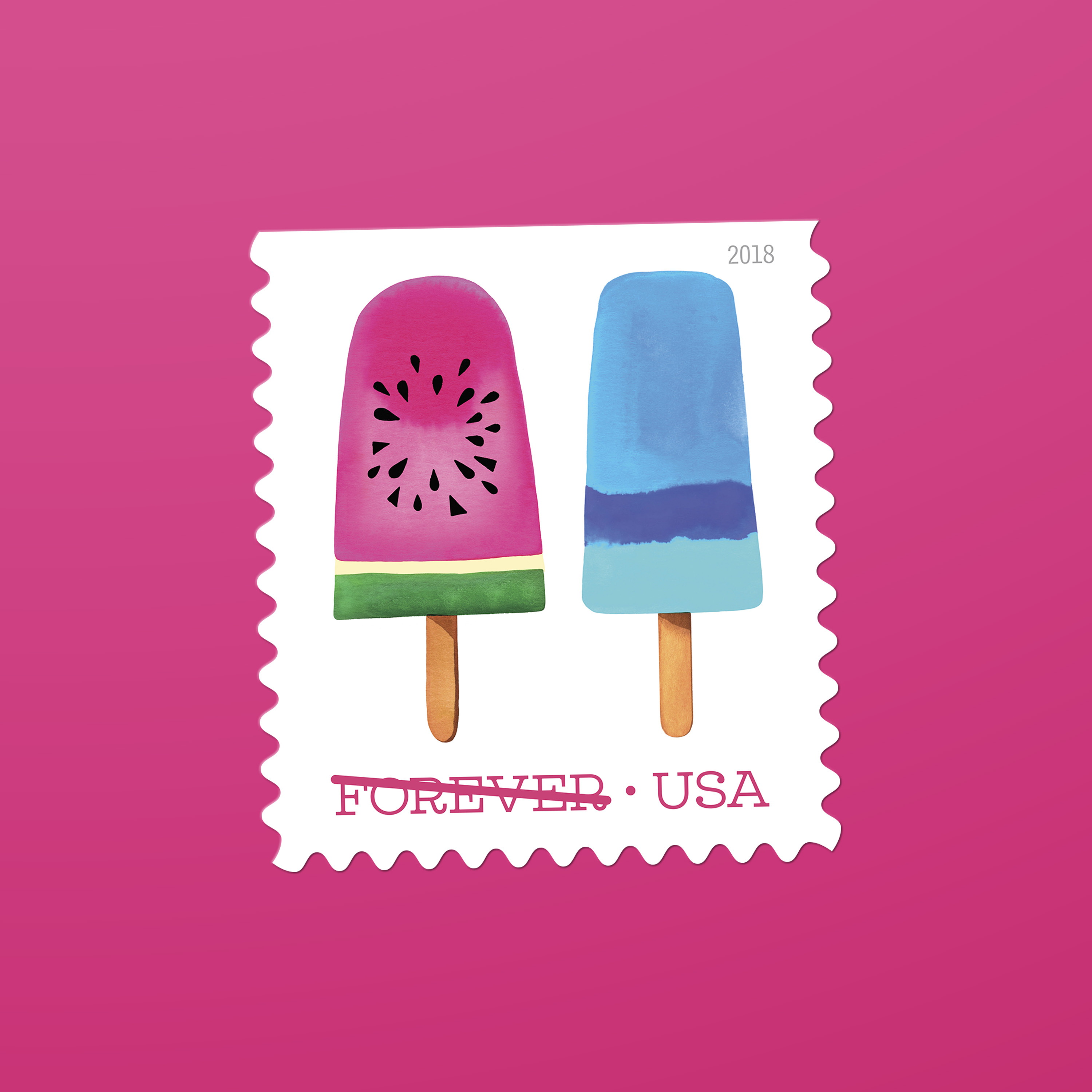 In 2018, the U.S. Postal Service issued its first — and so far only — scratch-and-sniff stamps. Frozen Treats, featuring Magrikie Berg’s whimsical watercolor illustrations of colorful, frosty pops on a stick, smelled as good as they looked. “The printer offered us a selection of fragrances, and we chose one that we felt was most reminiscent of the sweet scent of summer,” Duefrene explains.