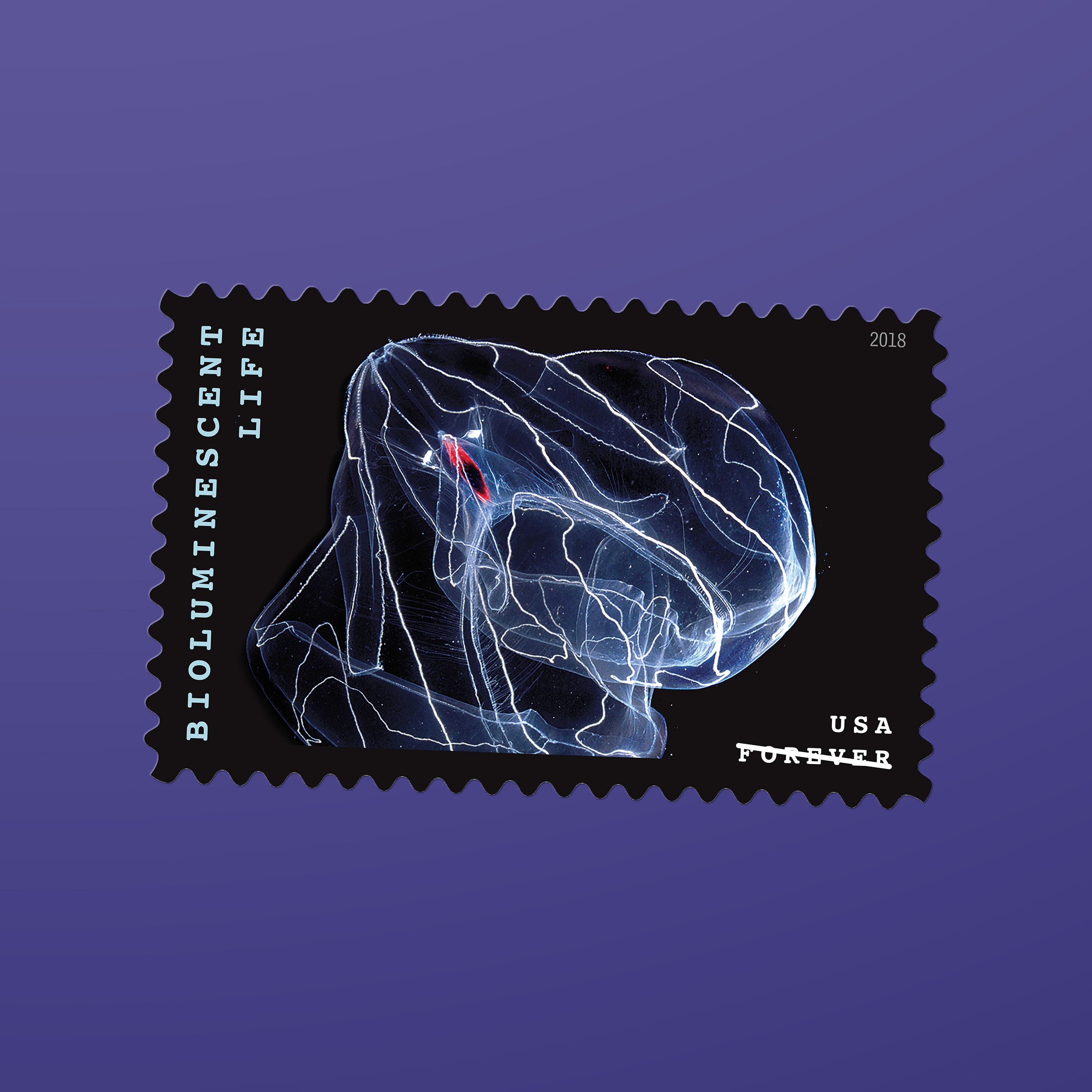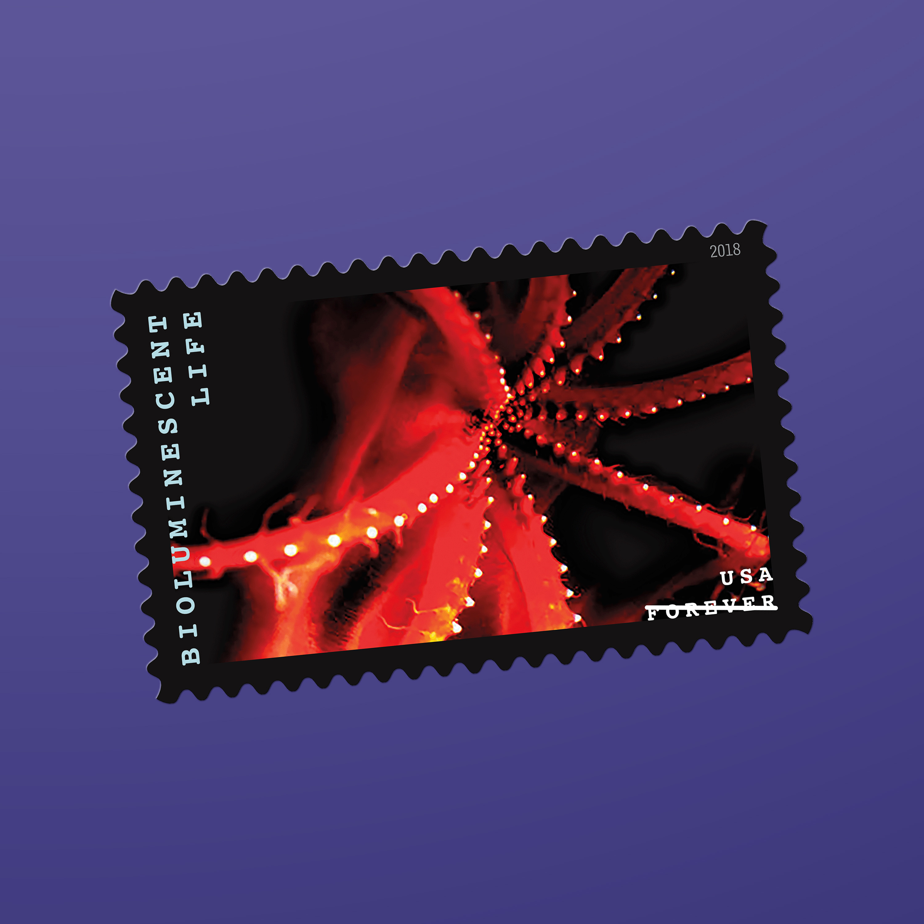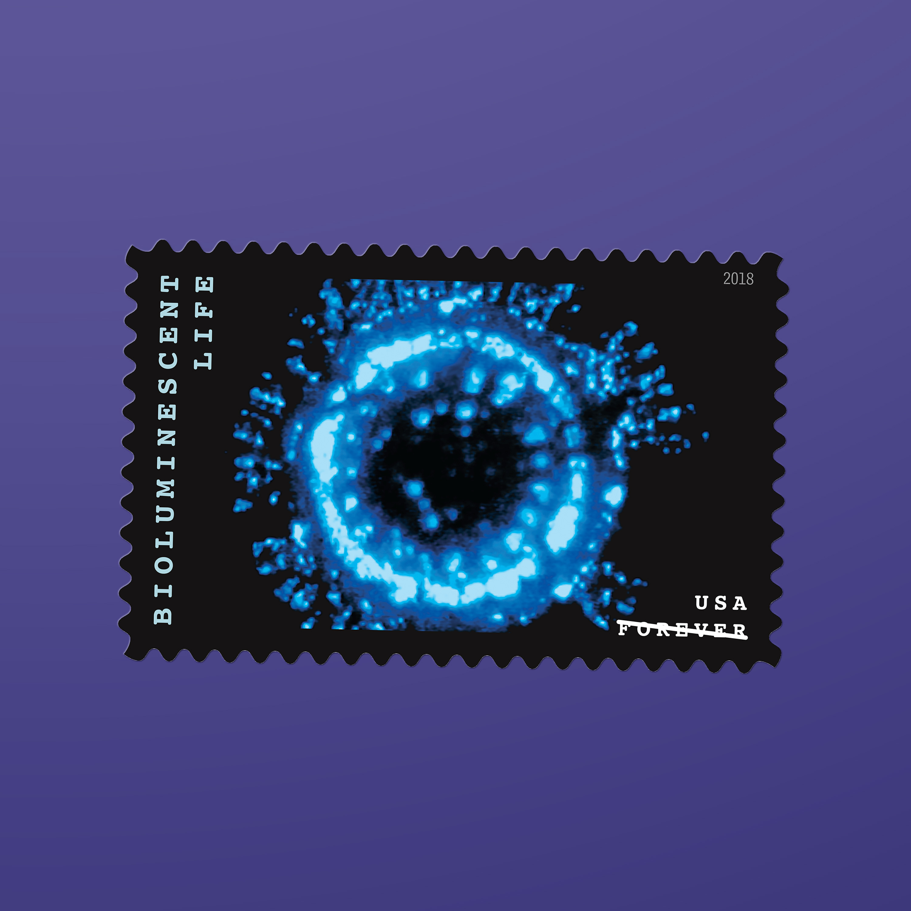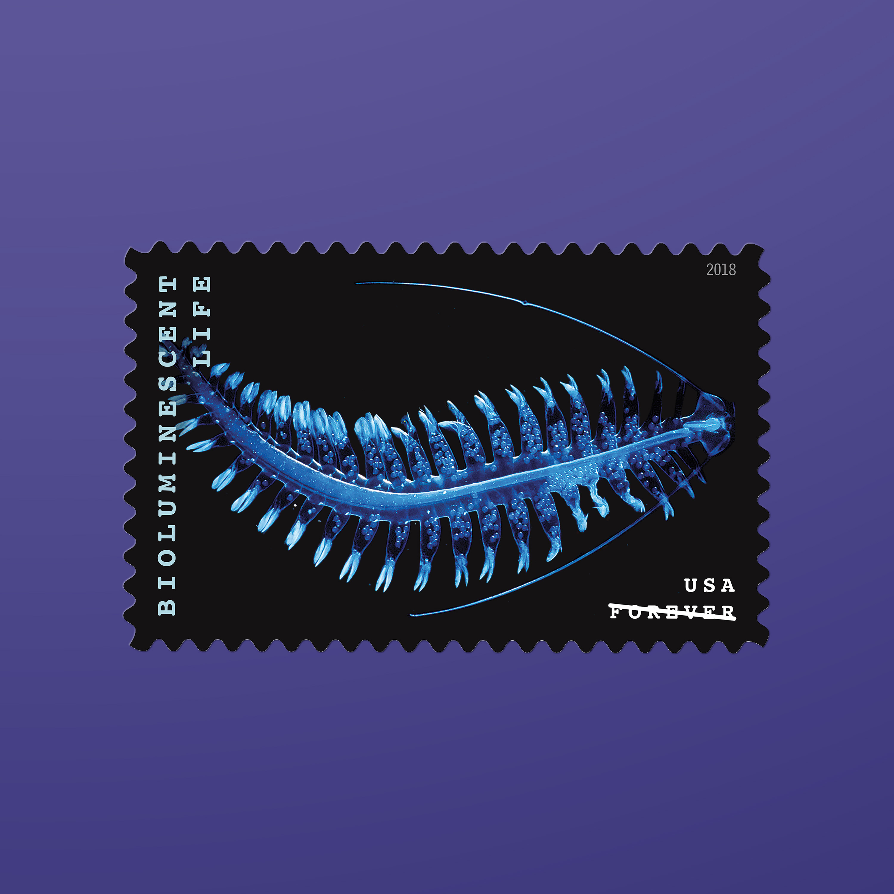 The 2018 Bioluminescent Life stamps, featuring 10 vivid photographs of 10 organisms that generate their own light, incorporated a proprietary rainbow holographic material that is highly reflective in white light. The print files were created using special techniques that enhanced the reflective qualities of the material while maintaining the stamp images’ color and detail. “The idea was to give these organisms movement and light,” Duefrene says.