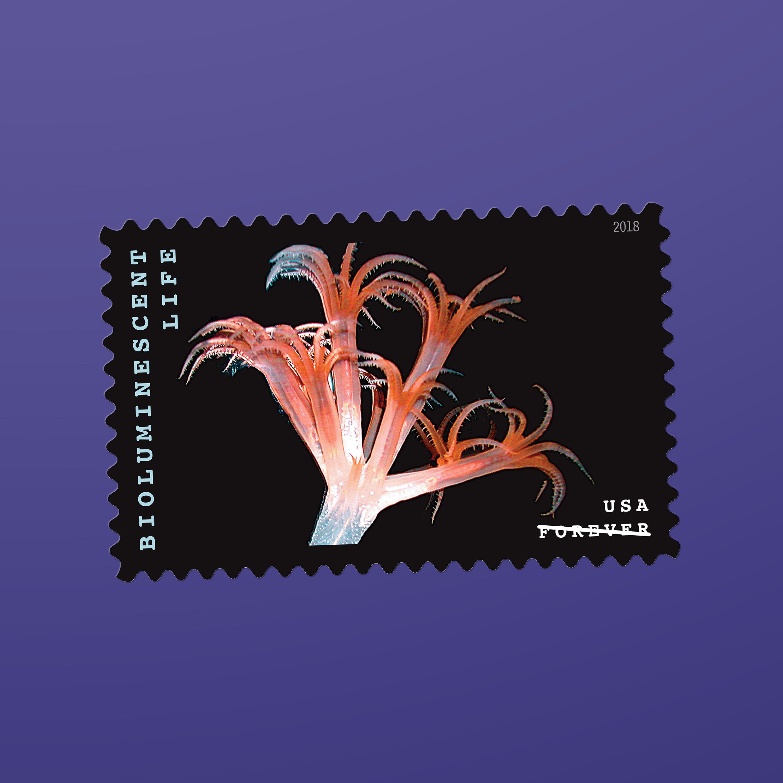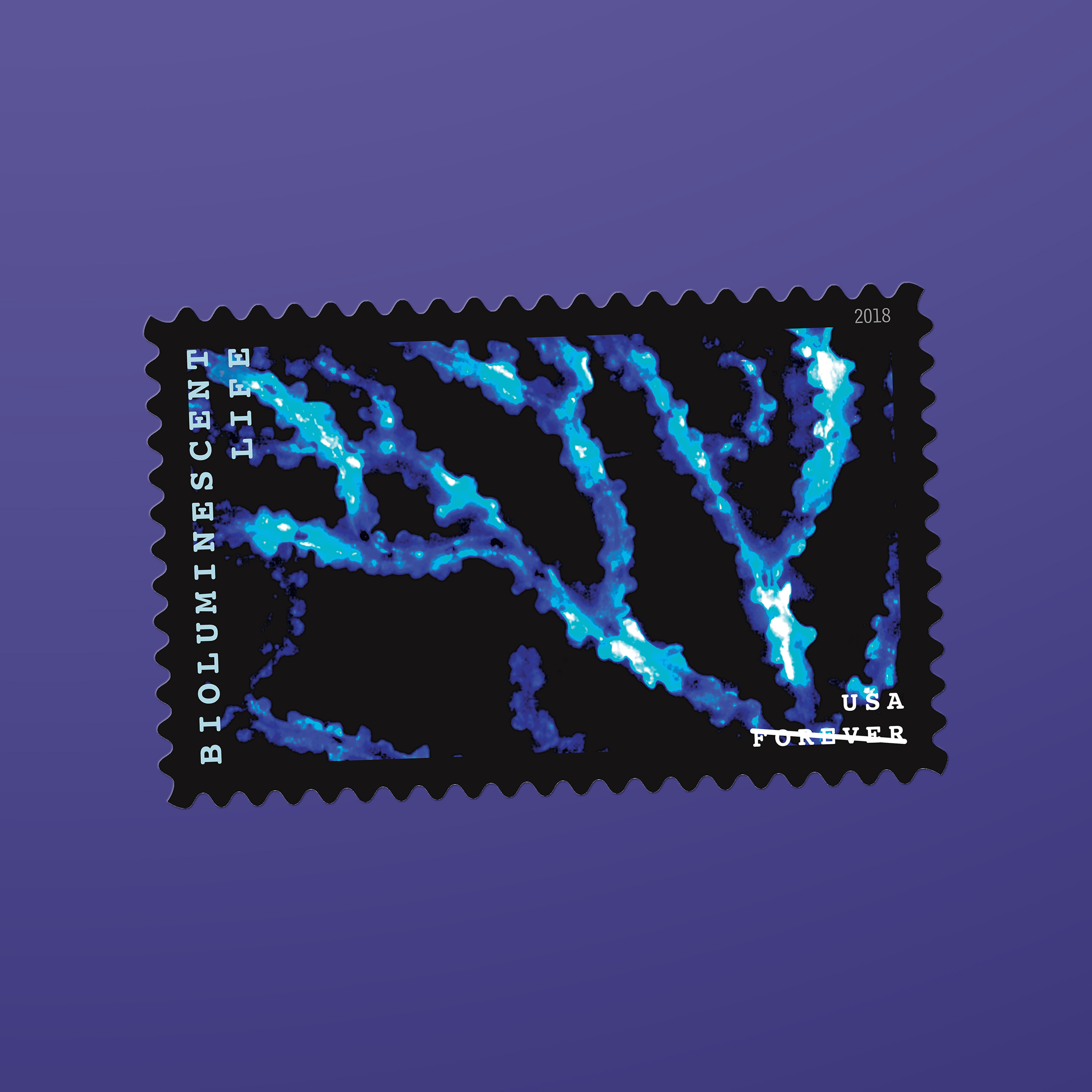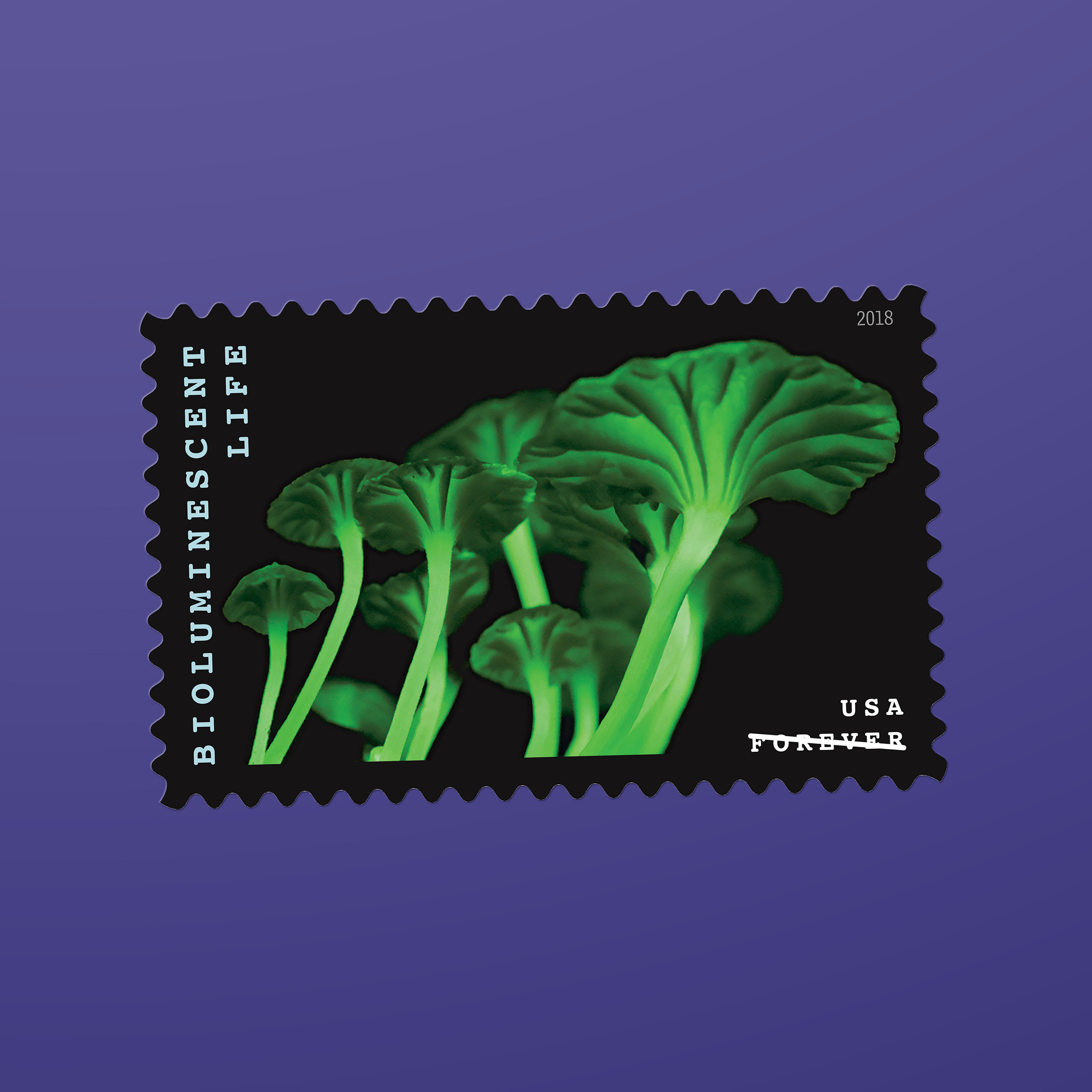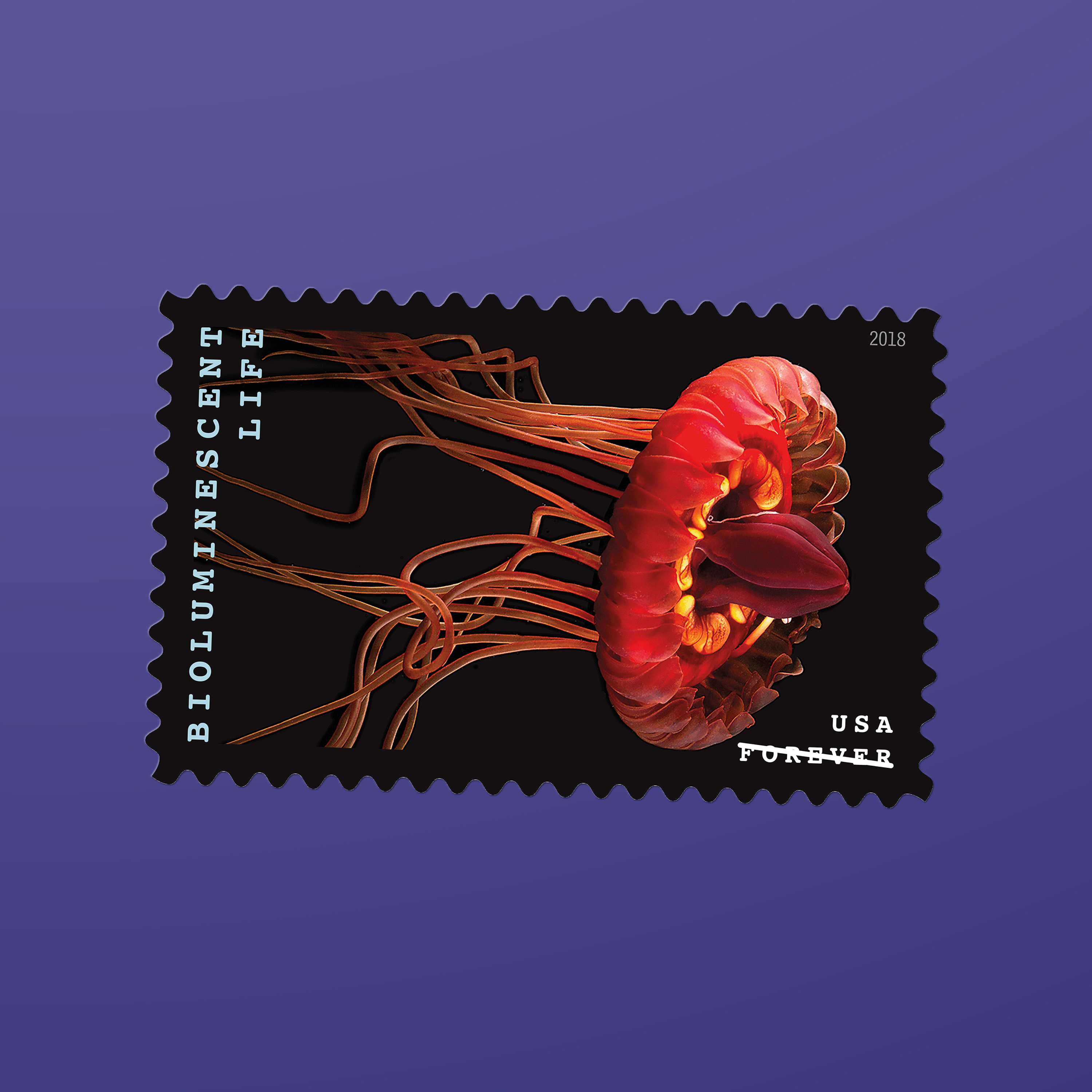 The 2018 Bioluminescent Life stamps, featuring 10 vivid photographs of 10 organisms that generate their own light, incorporated a proprietary rainbow holographic material that is highly reflective in white light. The print files were created using special techniques that enhanced the reflective qualities of the material while maintaining the stamp images’ color and detail. “The idea was to give these organisms movement and light,” Duefrene says.