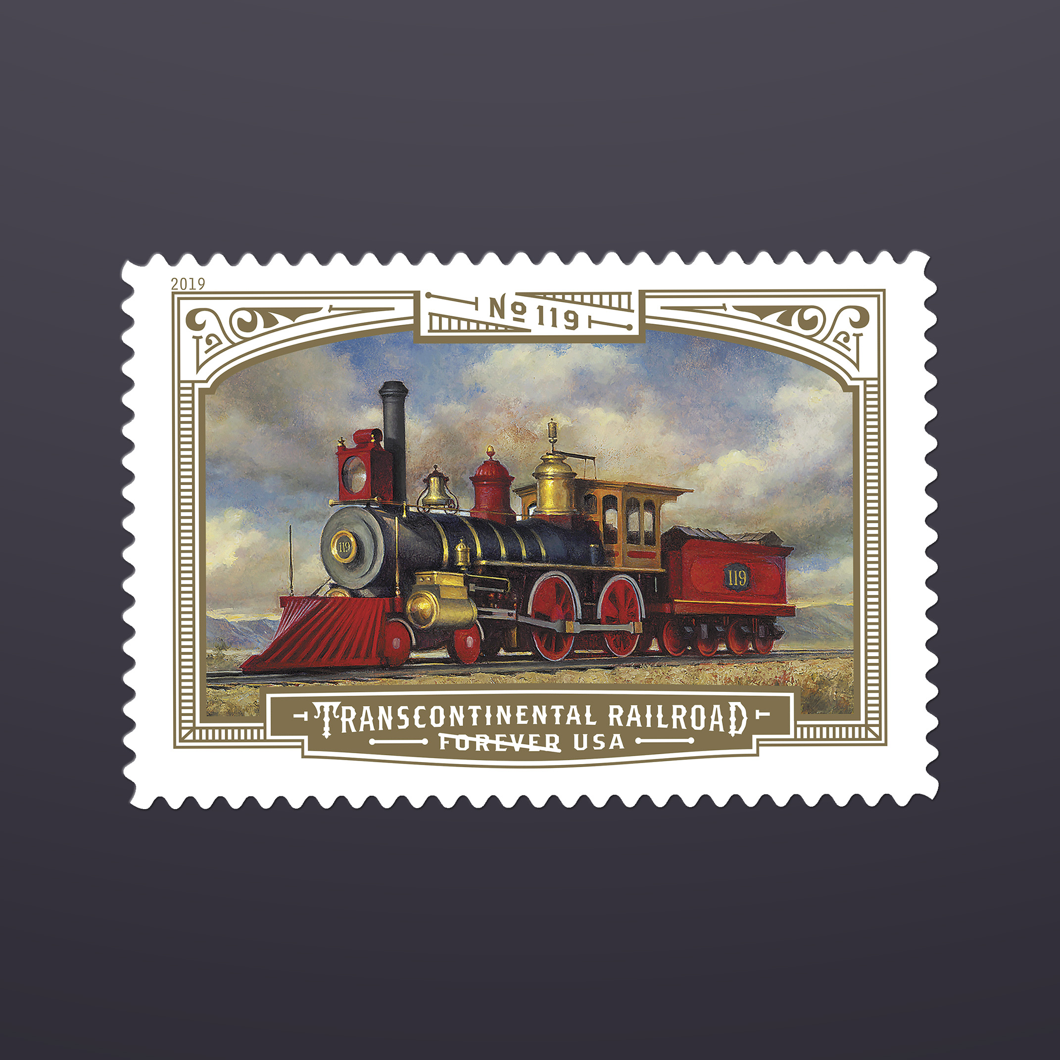 In 2019 USPS marked the 150th anniversary of the completion of the transcontinental railroad with a set of three different stamps in a pane of 18. Two of the three stamps feature the locomotives powering the trains that met in Utah. The third stamp depicts the famous golden spike that was a prominent part of the ceremony. Fittingly, each of the stamps and the header feature gold-foiled highlights that produce a glimmering effect.