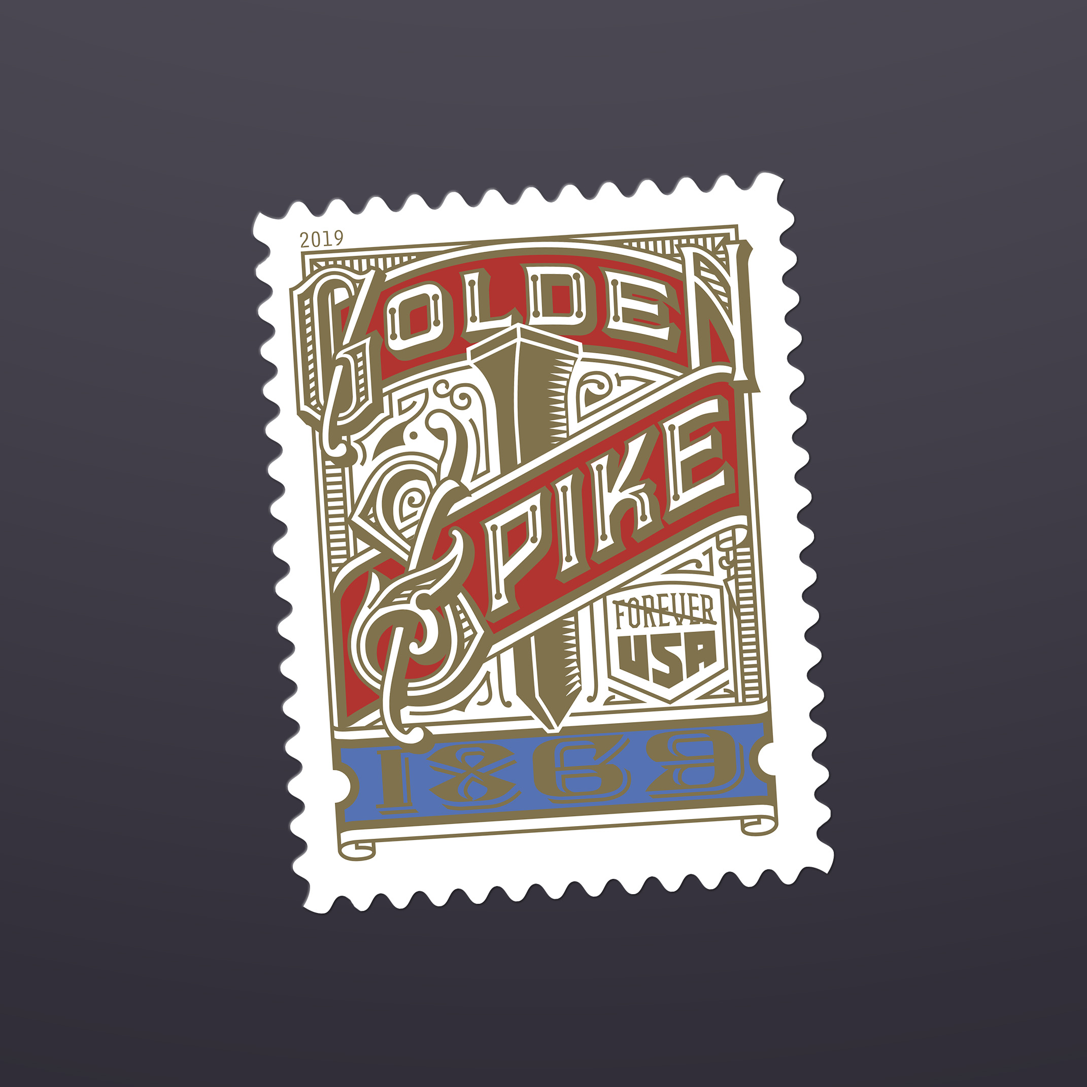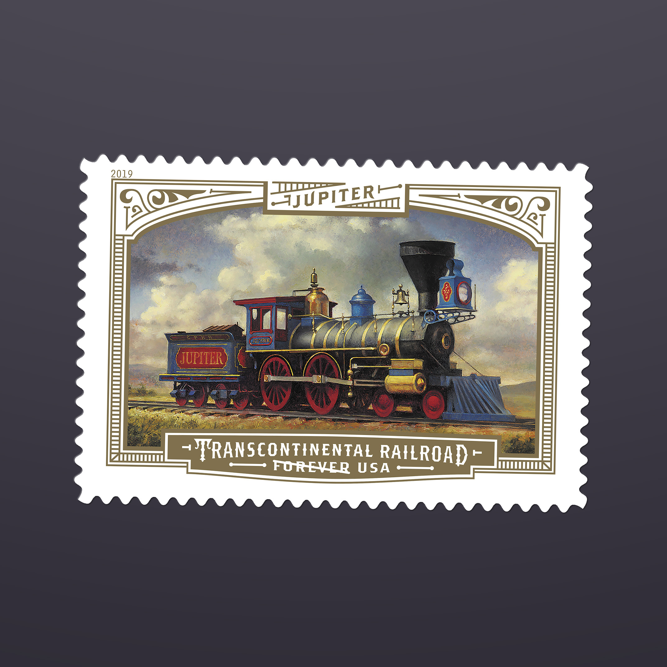 Greg Breeding, an art director for the Postal Service, designed the issuance using paintings of the locomotives by Michael J. Deas. Kevin Cantrell illustrated the stamp depicting the ceremonial golden spike and created the border treatments and typography for all three stamps.