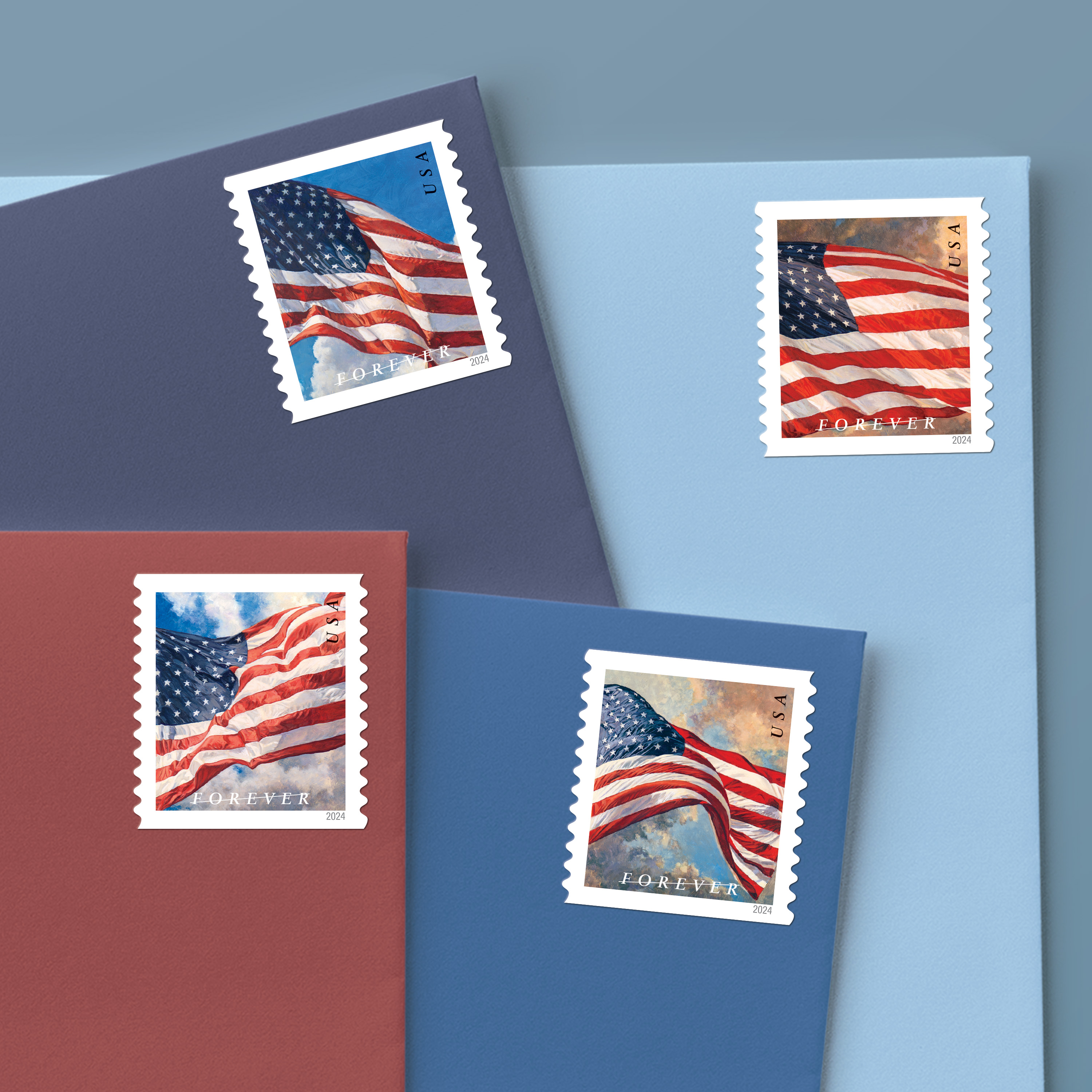 Hot off the presses with its release on June 7, 2025, this simple yet stately Forever stamp features the flag billowing in the wind, its vibrant colors popping against a white background. The U.S. Flag (2025) stamp is available in books of 20, panes of 20, and coils of 100, 3,000, and 10,000 for those who want to add a dash of elegant patriotism to their outgoing mail.
