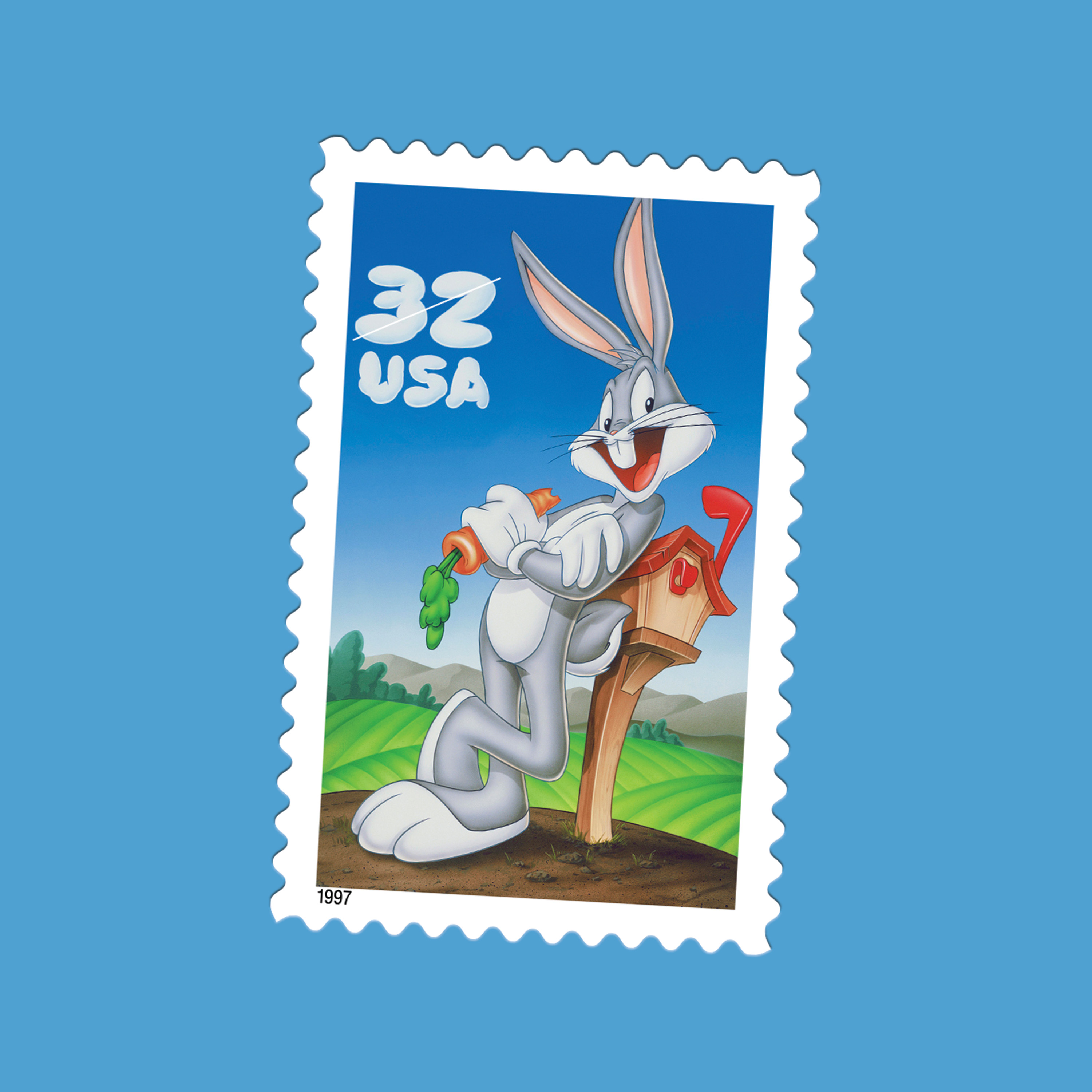 From his first official appearance in A Wild Hare (1940), Bugs established a style built on brains over brawn. His casual “What’s up, Doc?” — voiced by Mel Blanc — set the tone for a character who never seemed rattled, even when facing hunters, outlaws, or operatic rivals. That approachable cleverness helped make Bugs a natural fit for stamps, and in 1996 he was named the U.S. Postal Service’s “ambassador to youth,” encouraging young collectors to discover stamp collecting. The 1997 stamp captures that spirit, showing Bugs leaning on a mailbox, carrot in hand.