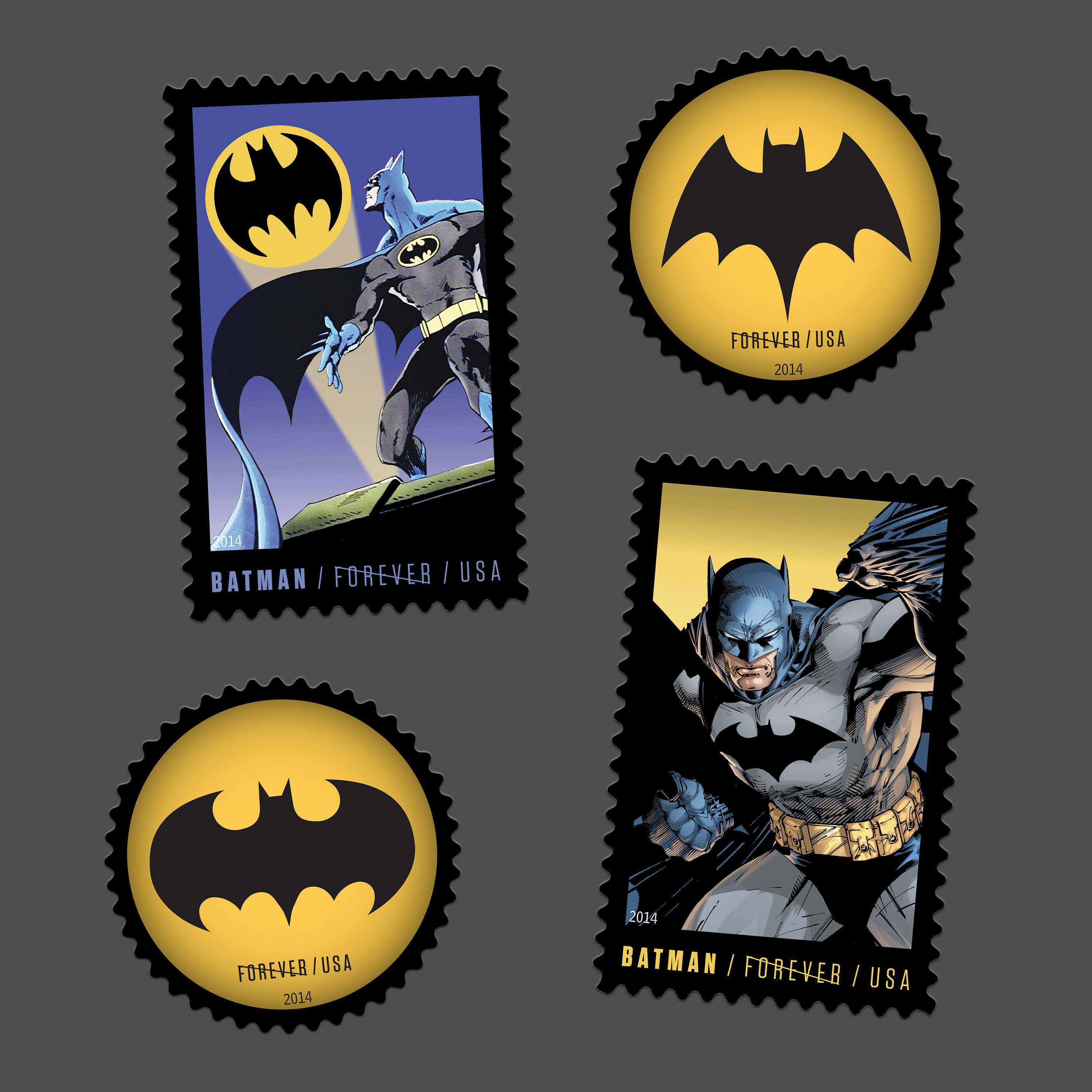 The pane presents four versions of Batman drawn from different comic book eras. From his Golden Age beginnings under artist Bob Kane through later transformations in the Silver, Bronze, and Modern Ages, the stamps show how both character and style have shifted over time.