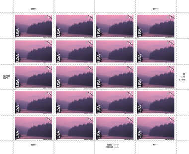 This international rate stamp in the Scenic American Landscapes series features a photograph of sunrise on the Androscoggin River in the 13 Mile Woods in Errol, New Hampshire.