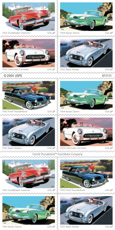 These five stamps feature the sporty look of American cars designed in the 1950s, a decade marked by post–World War II euphoria and economic prosperity. The cars selected are the 1952 Nash Healey, 1953 Chevrolet Corvette, 1953 Studebaker Starliner, 1954 Kaiser Darrin, and 1955 Ford Thunderbird.
