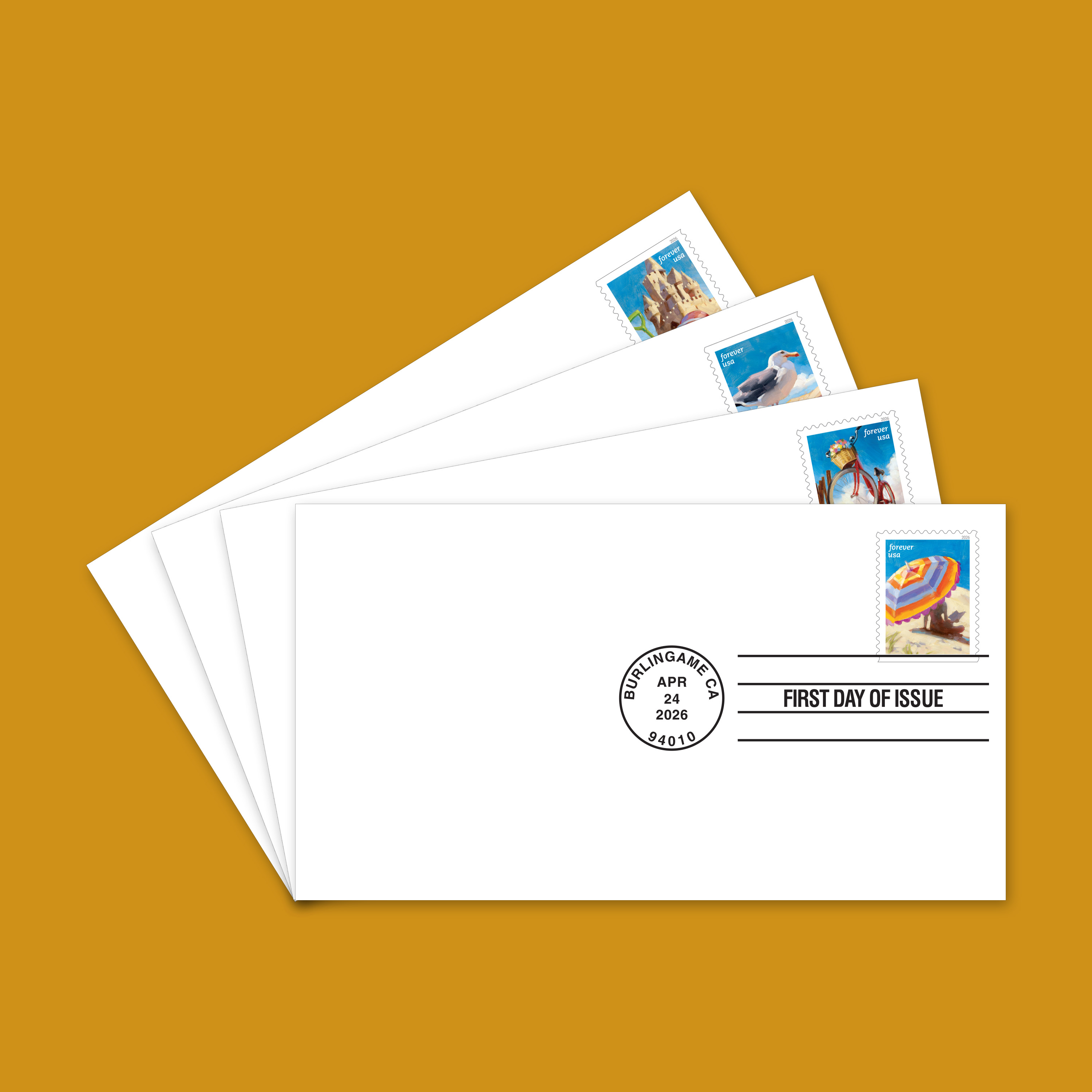 Celebrate the simple joys of a coastal escape with the A Day at the Beach First Day Covers. Each collectible envelope in the set of 4 has an affixed Forever® stamp canceled with the official First Day of Issue postmark.