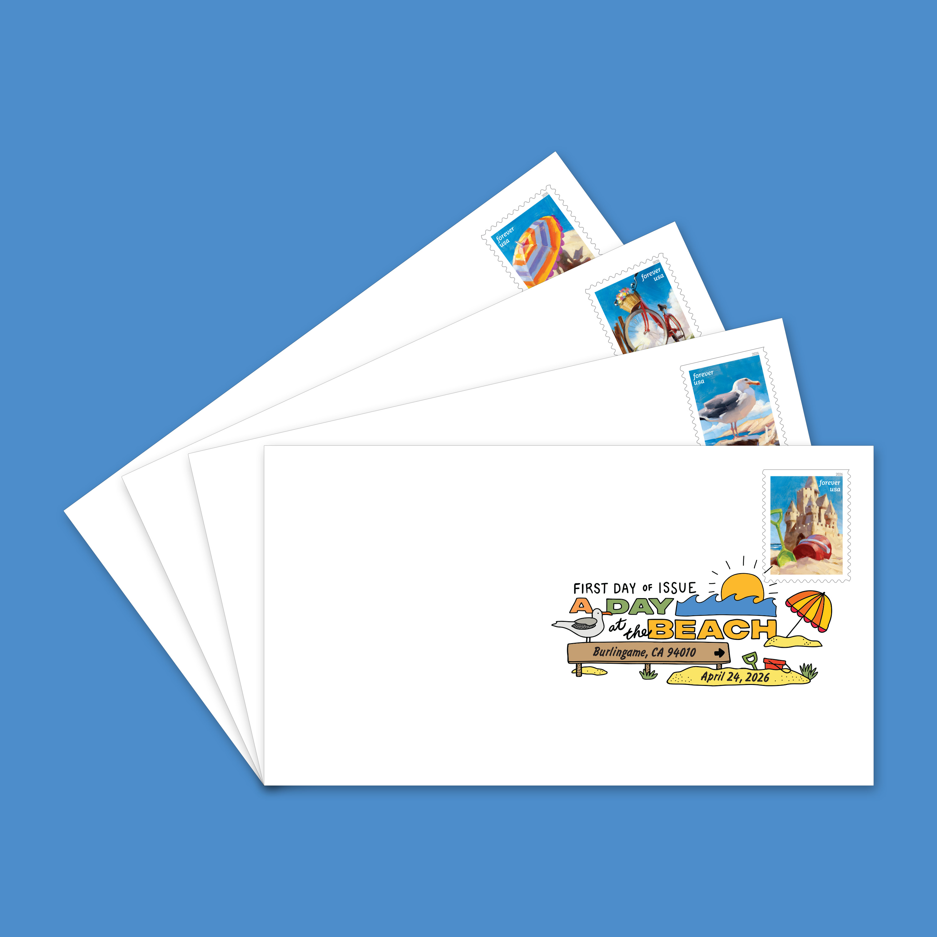 Celebrate the simple joys of a coastal escape with the A Day at the Beach Digital Color Postmarks. Each of the collectible envelopes in this set of 4 features a full-color postmark canceling the A Day at the Beach Forever® stamps — the perfect keepsake for beachgoers and collectors alike.