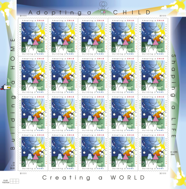 The stamp design also features the following four phrases surrounding the art: Adopting a Child, Shaping a Life, Building a Home, and Creating a World.