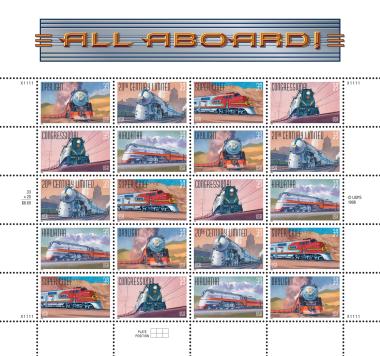 The All Aboard stamps feature five luxury trains from America's past: the Southern Pacific Railroad Daylight; the Pennsylvania Railroad Congressional; the New York Central 20th Century Limited; the Chicago, Milwaukee, St. Paul and Pacific Railroad Hiawatha; and the Santa Fe Super Chief.