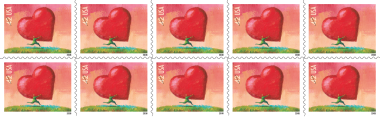 Obviously, the stamp’s love-struck figure has not been daunted by a familiar and oft-used quotation, “A hundred hearts would be too few / To carry all my love for you.” In fact, Zwolak’s design features a centrally placed bright red heart that is so full of love that it has lifted its owner from the ground, perhaps hoping to speed up delivery of its special affection.