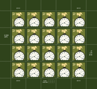 The self-adhesive American Clock stamp is the second issue of the American Design Series that began with the 2002 American Toleware coil stamp. It replaced the 10¢ Red Cloud stamps of 1987-94. The design is from a clock made about 1805 by Simon Willard of Massachusetts.