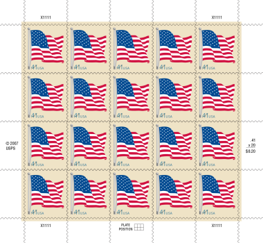 On August 15, 2007, in Washington, D.C., the Postal Service issued a 41-cent, definitive Flag stamp, available both as a booklet and coil. The stamp was designed by Richard Sheaff of Scottsdale, Arizona.