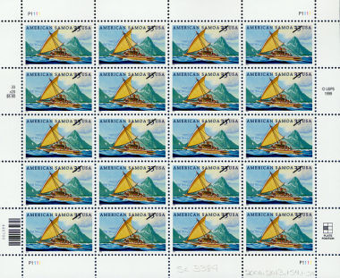 Illustrated in gouache by Hawaiian artist Herb Kawainui Kane, the stamp art depicts an 'alia, the traditional double canoe. Sunuitao Peak, on the island of Ofu, can be seen in the background.