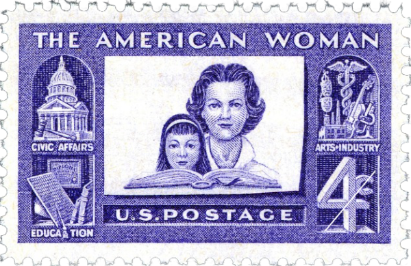This American Woman stamp pays tribute to American women and their accomplishments in civic affairs, education, arts, and industry. The stamp features an image of a mother and daughter in front of an open book. A building and gavel symbolize women’s participation in civic affairs such as government or judicial organizations. A mortar board, books, and diploma symbolize women’s participation in education and academia. A caduceus, microscope, violin, and mask of drama symbolize women’s participation in the arts, such as entertainment and music, and industries, such as medicine and scientific research.