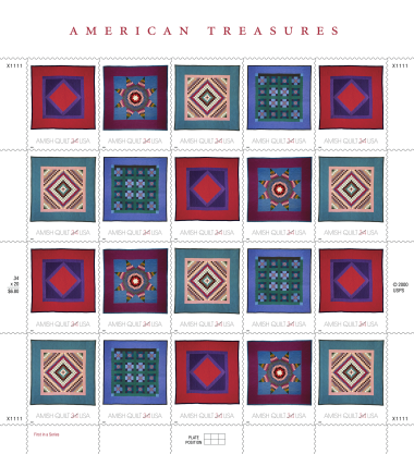 In 2001 the U.S. Postal Service paid tribute to a uniquely American folk art form — the Amish quilt. Distinctive in its simplicity, symmetry, deft needlework, and broad fields of deep color, the Amish quilt is one of the most expressive traditions in American design. Amish quilting traditions vary from region to region, yet all are influenced by the religious and social values of Amish daily life: humility, simplicity, modesty, and serviceability.