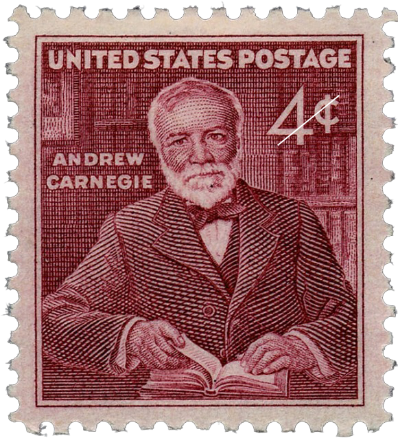 This Andrew Carnegie stamp features a portrait of the Scottish-American industrialist and philanthropist. After working in a cotton factory and telegraph office as a boy, Carnegie went to work with the Pennsylvania Railroad Company. Carnegie became a “self-made” man by learning about investments and cost management. He left the company to start the Keystone Bridge Company and consolidated his iron and steel assets to create the Carnegie Steel Company. He made his fortune from the steel industry. He was a philanthropist, whose donations helped to establish such places as Carnegie Hall in New York City, the Carnegie Institute of Technology (now known as Carnegie Mellon University) in Pittsburgh, and the Carnegie Institution in Washington, D.C.