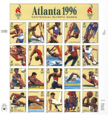 Commemorating the 100th anniversary of the modern Olympic games, the Postal Service issued 32-cent 1996 Centennial Olympic Games stamps on May 2, 1996, in Atlanta, Georgia.