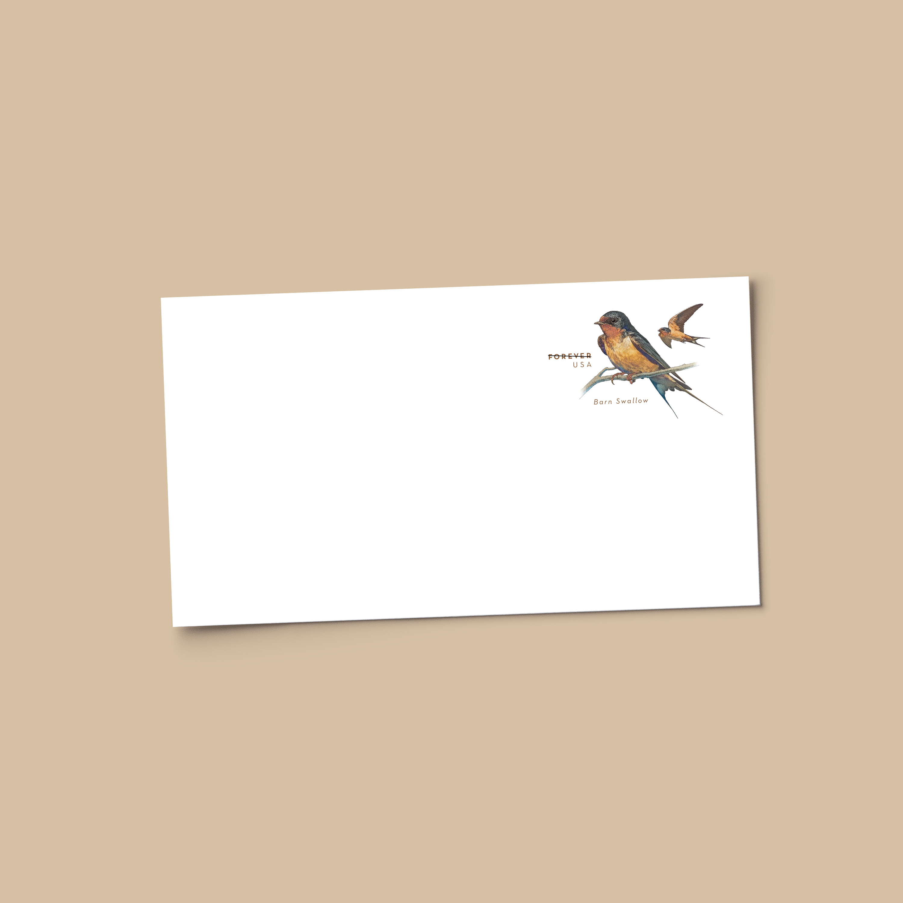 The U.S. Postal Service® celebrates a favorite backyard bird with the issuance of the Forever #6 3/4 Barn Swallow Regular Stamped Envelope with (WAG) water-activated gum.