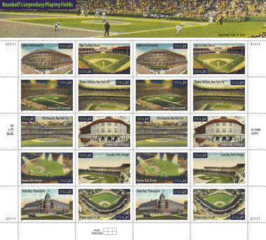 In association with Major League Baseball, the U.S. Postal Service commemorated 11 legendary playing fields. Appearing on the 10 stamps are: Comiskey Park in Chicago, Crosley Field in Cincinnati, Ebbets Field in Brooklyn, Fenway Park in Boston, Forbes Field in Pittsburgh, Polo Grounds in New York City, Shibe Park in Philadelphia, Tiger Stadium in Detroit, Wrigley Field in Chicago, and Yankee Stadium in New York City. Sportsman’s Park in St. Louis is featured on the header.