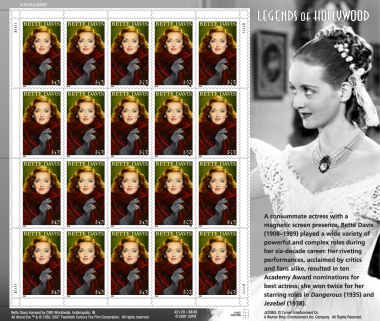 With the issuance in 2008 of the 14th stamp in the Legends of Hollywood series, the U.S. Postal Service honors American film diva Bette Davis (1908–1989) on the 100th anniversary of her birth.